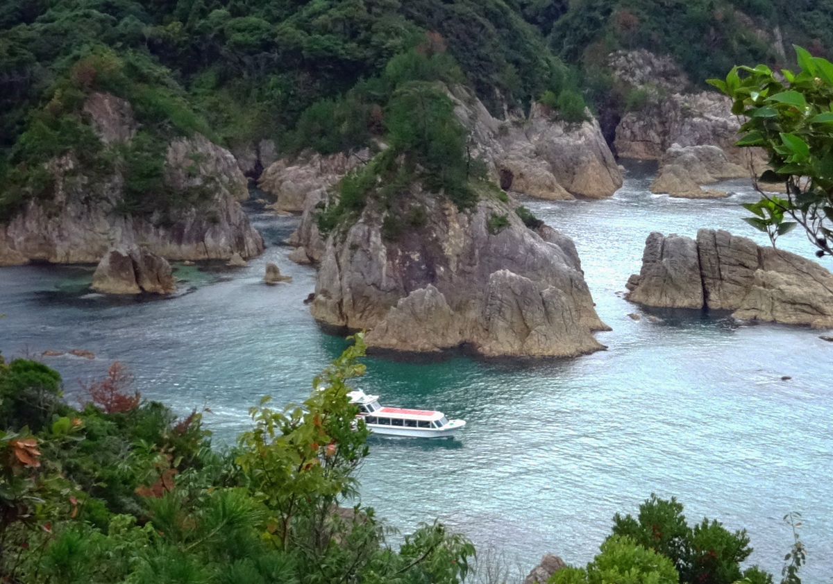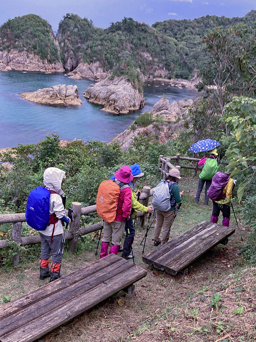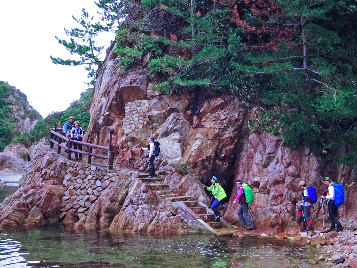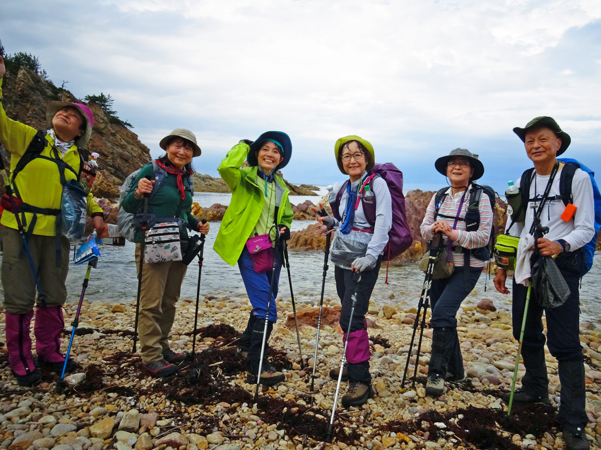 4日は前線が日本海を通過する予報で雨雲は私達を追いかけてきたが、うまい具合に沖を通過してくれて穏やかな海岸美を堪能した。