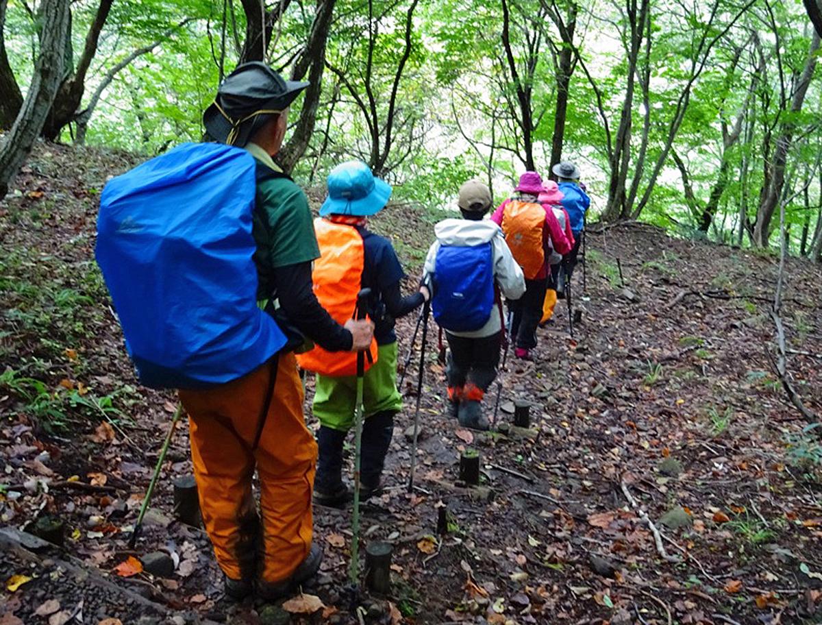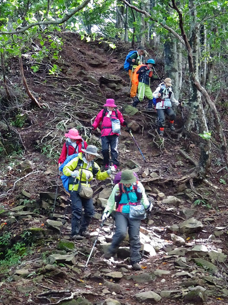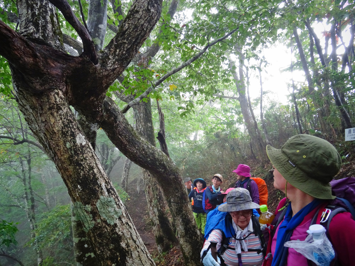 5日は朝から小雨だったが、登っているうちに止んできた。展望はなかったけれども気持ちの良い森の道だった。(白築)