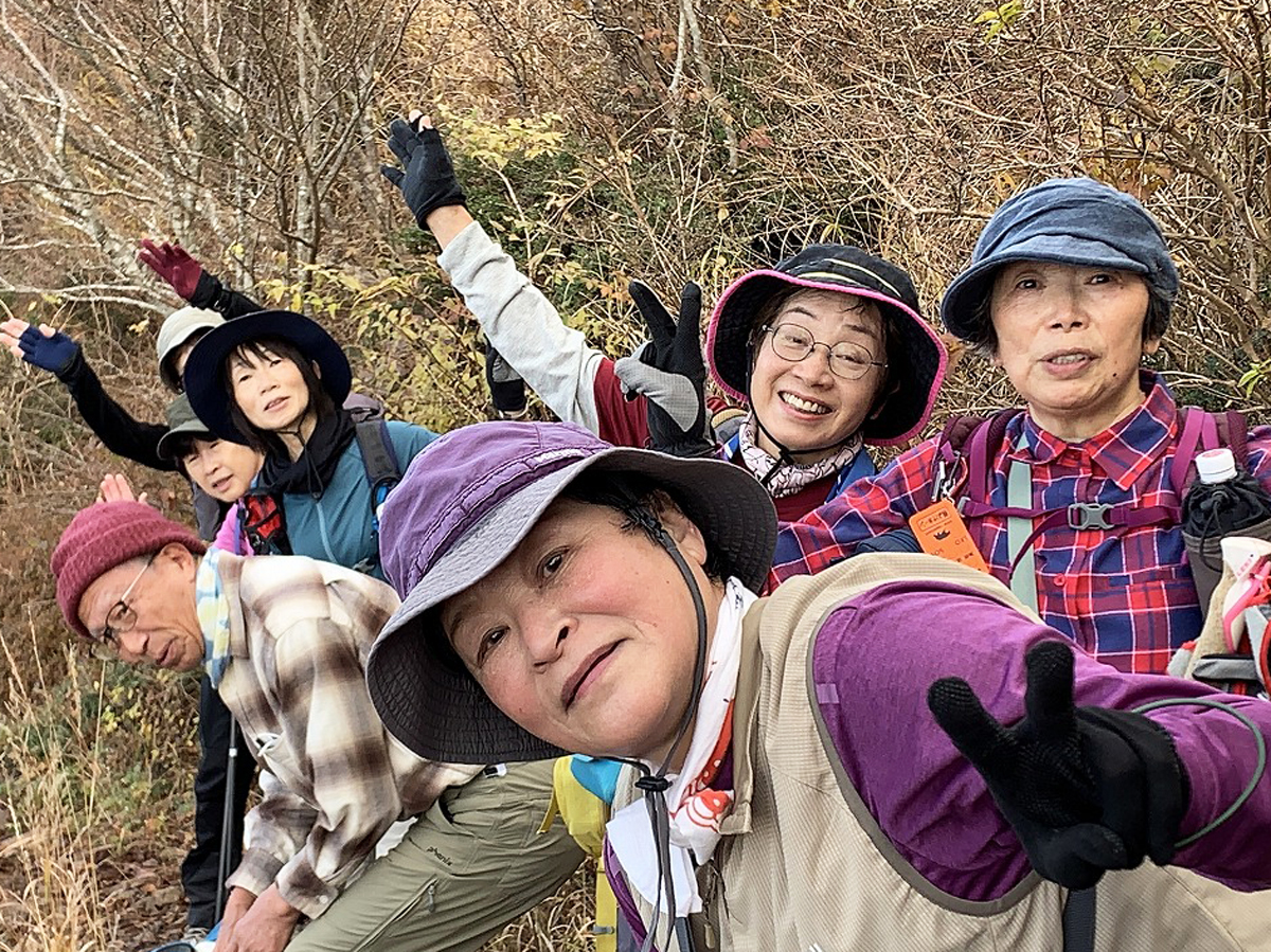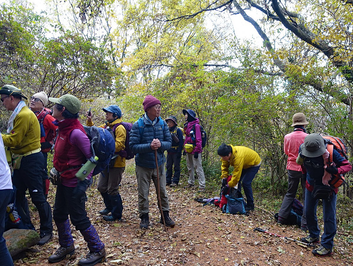 西の原Pでは、初冬を感じる冷たい風!少し曇っていましたが、ストレッチ体操で体をほぐして18名が元気で登山口を出発。