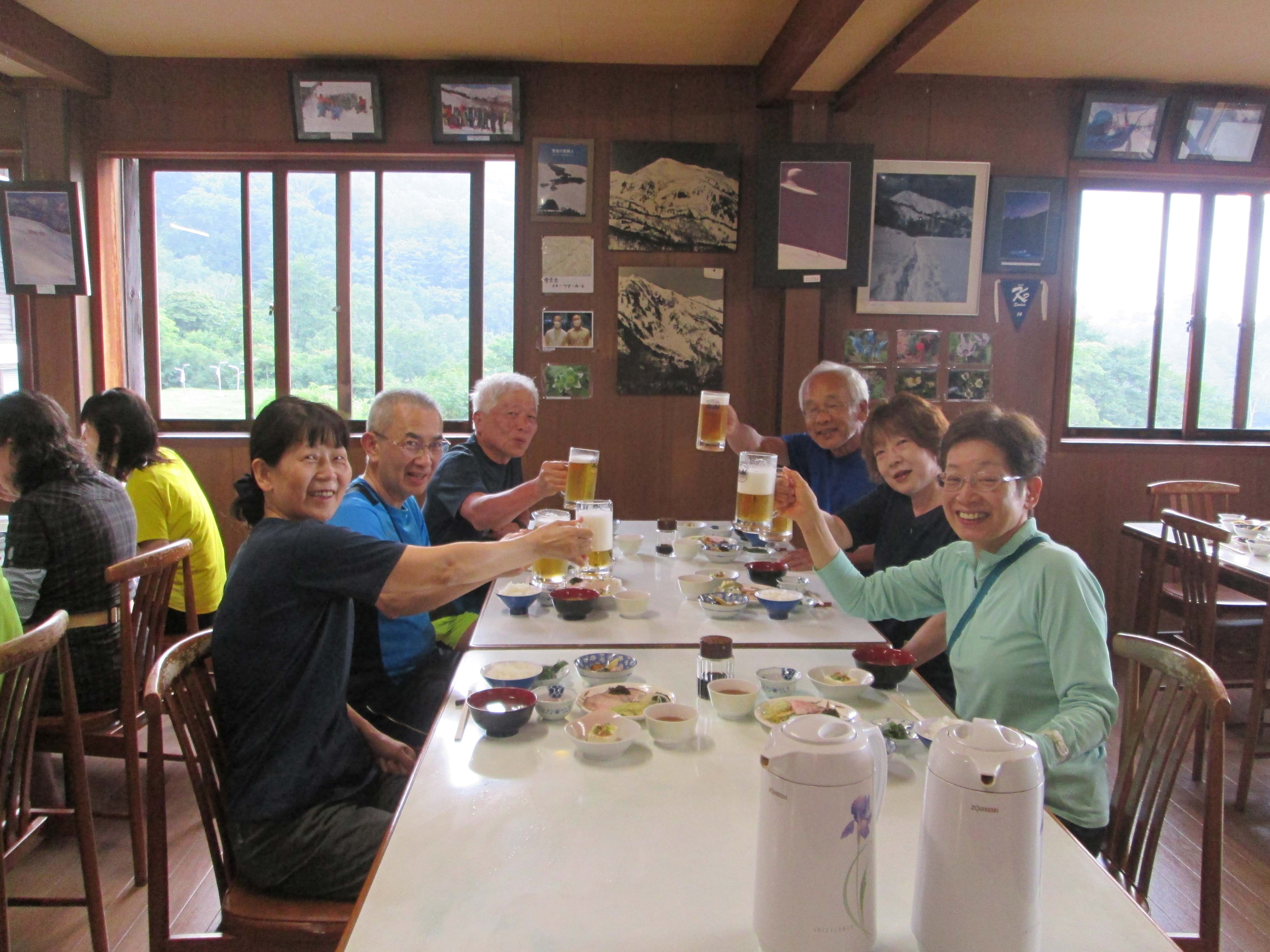 15_蓮華温泉でB班とお互いの無事を確認して合同祝賀会