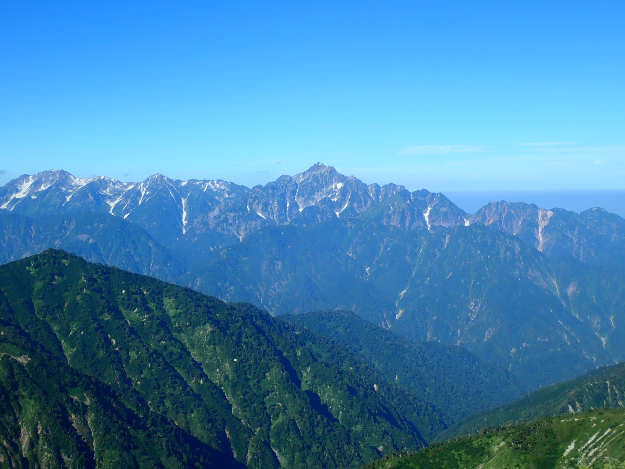 07_前方に見えるは、到着地点の五竜岳 2,814mと右手に”穂高連邦”と”槍ヶ岳”の景観にうっとり