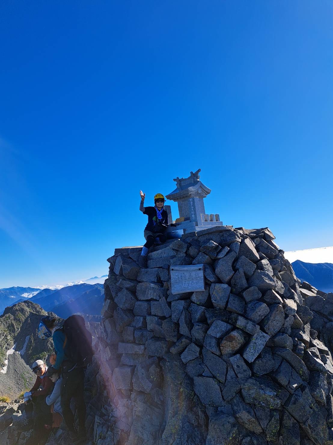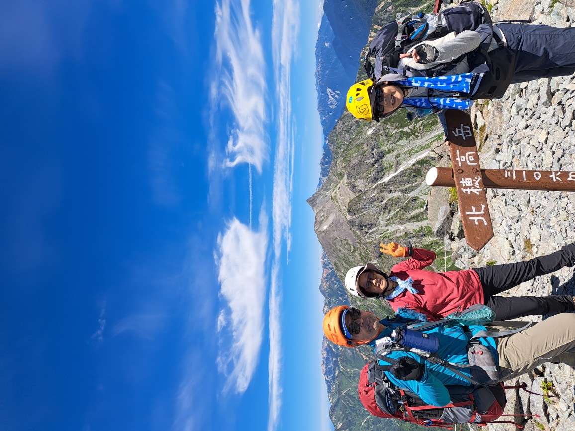 6 やらやっとで北穂山頂。最高の天気が嬉しい。表銀座組は今どこだろうか