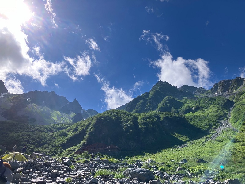 3 涸沢小屋と明日歩く稜線(右端の北穂山頂から左端の穂高岳山荘まで)