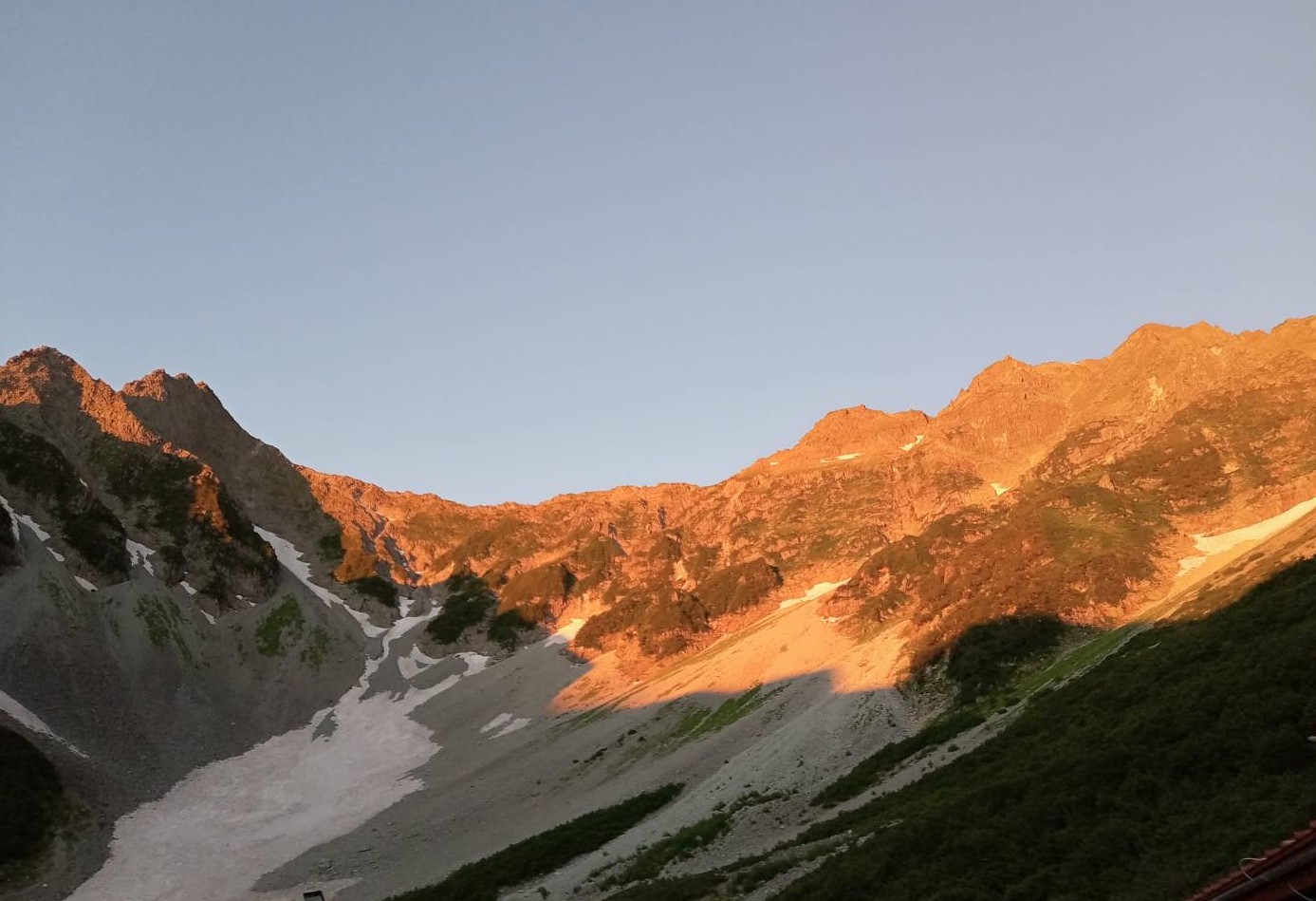 4 モルゲンロートに染まる奥穂、吊尾根、前穂