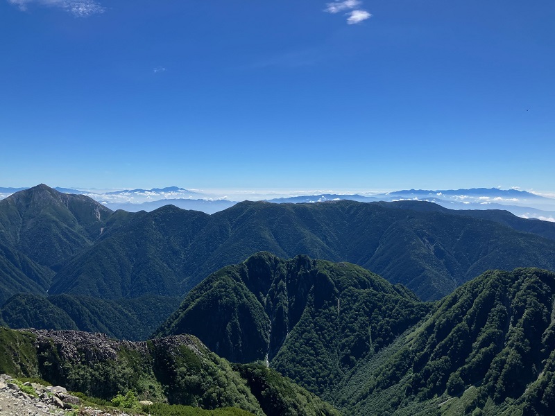 13 昨日歩いた縦走路を見渡す。槍の右が北穂、左が涸沢岳