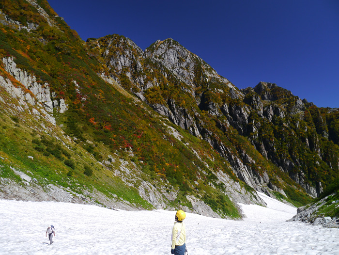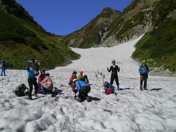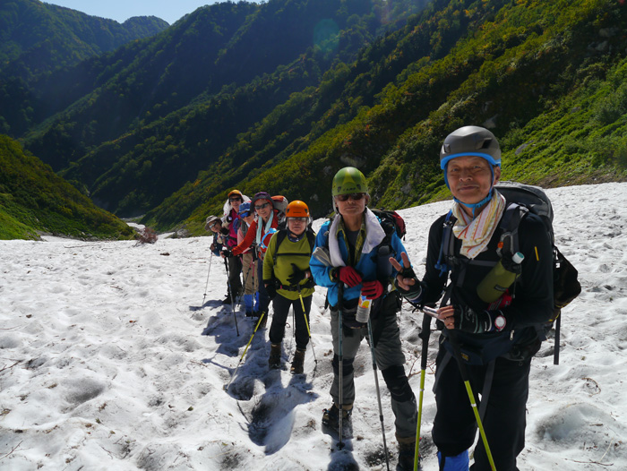 劔沢雪渓を登り返す