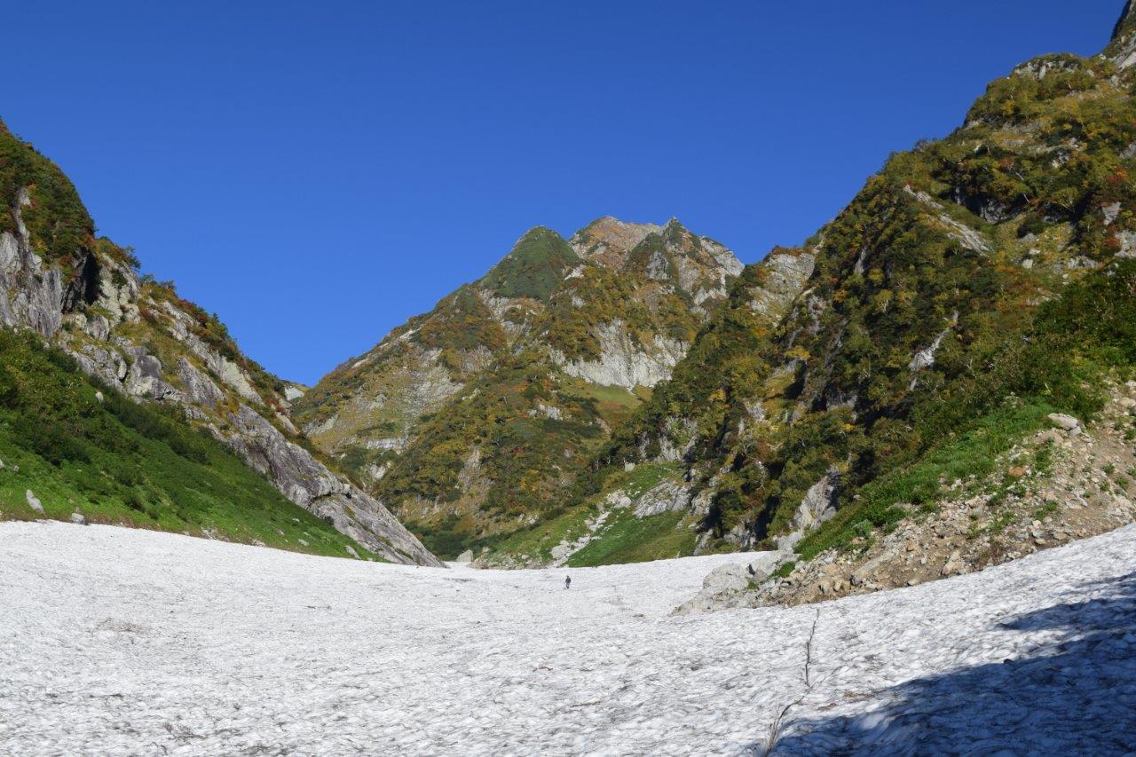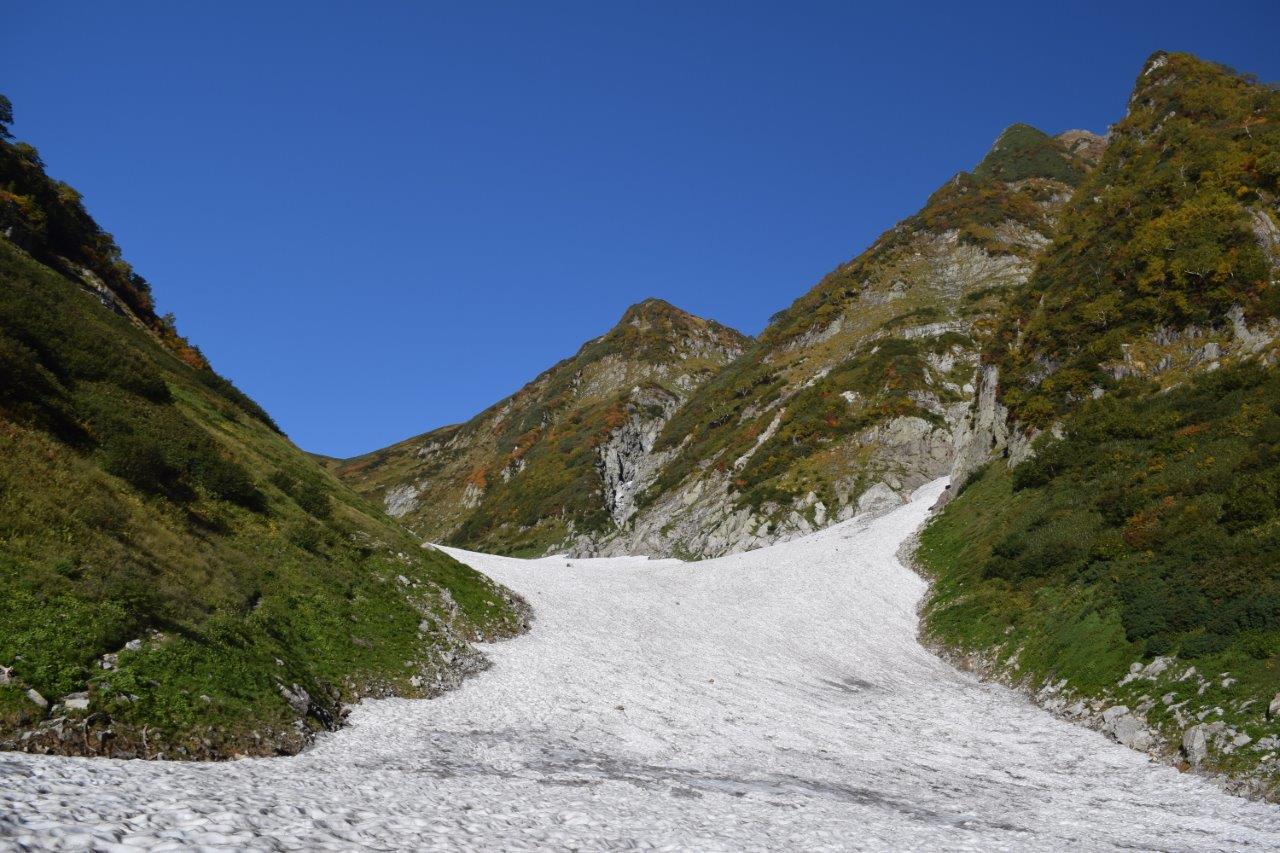 冷え込んだ雪渓にアイゼンの爪が刺さり、気持ちよく歩けた