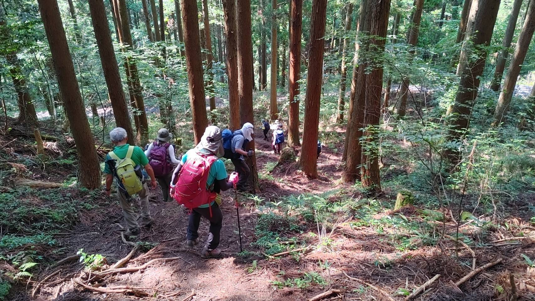 登りはいきなりの急登であり、スタミナを使い果たし、暑さとのたたかい。尾根歩きも日陰が少なく体力を消耗した。