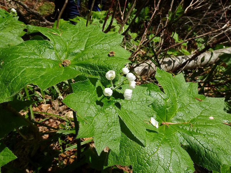 2 雪解けすぐのサンカヨウは葉にごみを背負って花を咲く