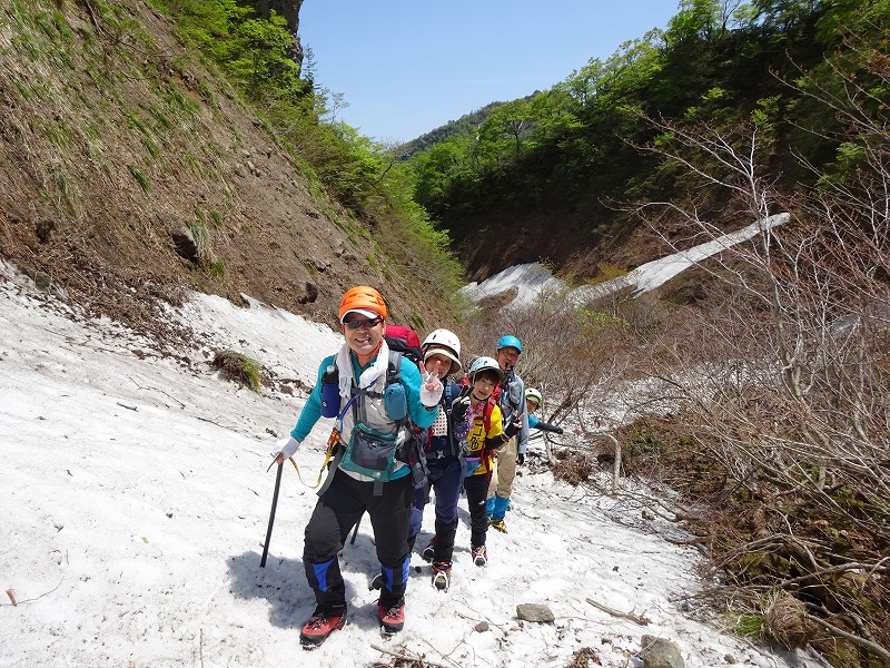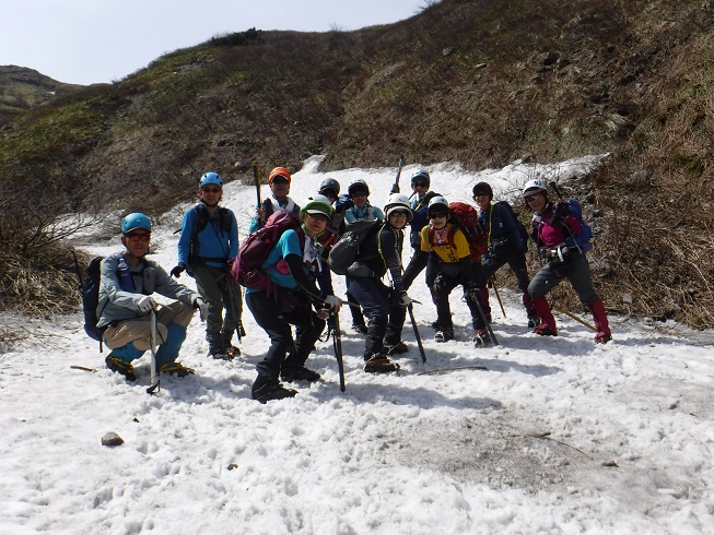 しかし、振子沢ではアイゼン・ピッケル・ヘルメットを装着し、約1時間の雪渓歩きをしっかりと