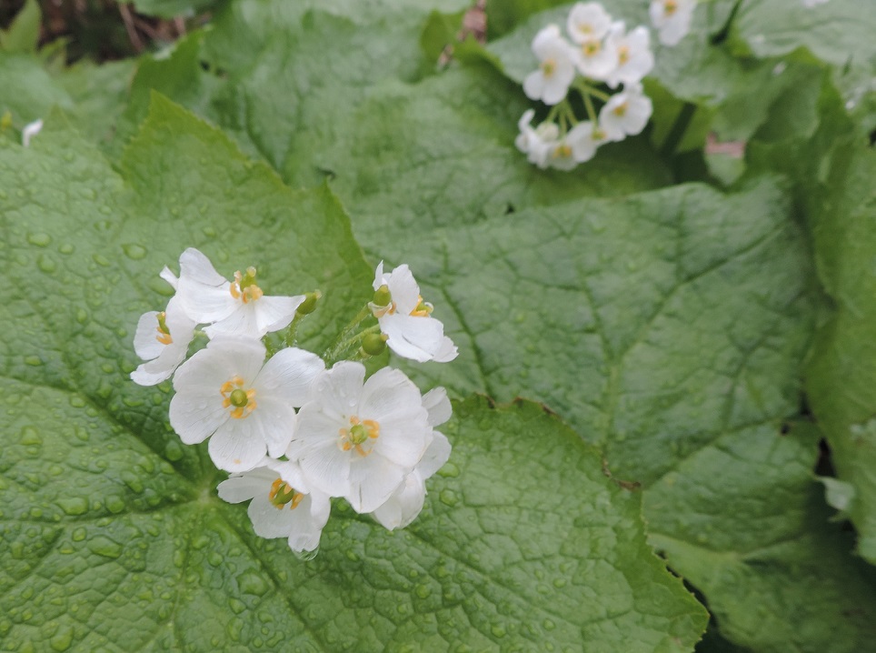 象山へ登る途中から雨になったが、雨も悪いことばかりではない。サンカヨウの花びらが雨に濡れると本当に透明になってくることを皆で確認できたのだ!