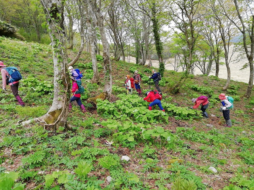 今回の山行の主な目的は花。一番のお目当て、サンカヨウの大きな群落が登山口のすぐ近くにある。