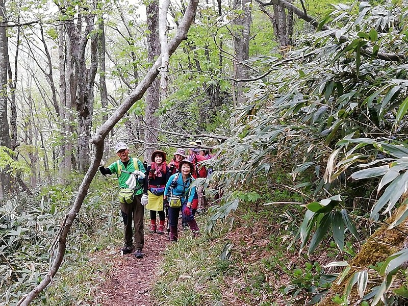 鮮やかな新緑が目に染みる登山道は歩きやすくて快適、初めての参加者から「この道、好き」との声が聞こえる。