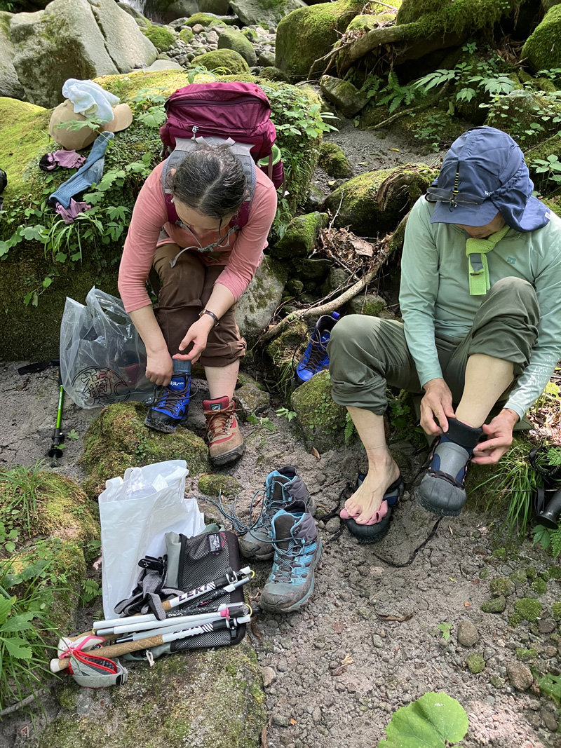 新調の沢靴を履く二人。沢靴仲間が増えて嬉しい