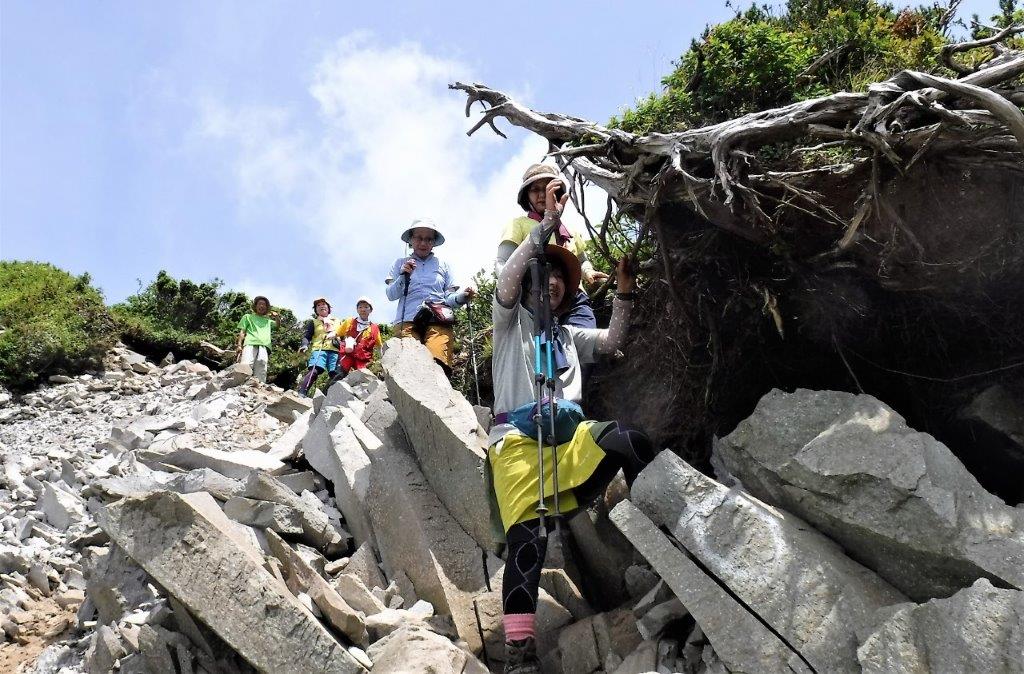 上宝珠手前の崩落個所は毎年形状を変えており、今後の通行が危ぶまれる。ユートピア小屋付近で昼食。
