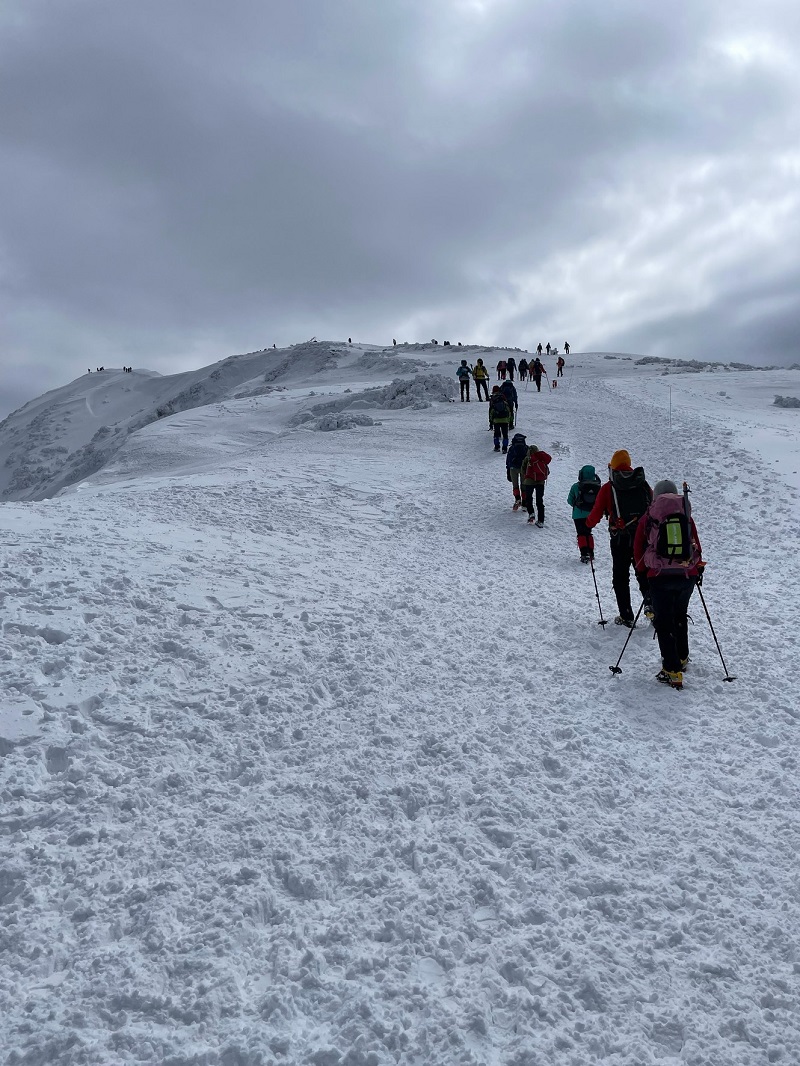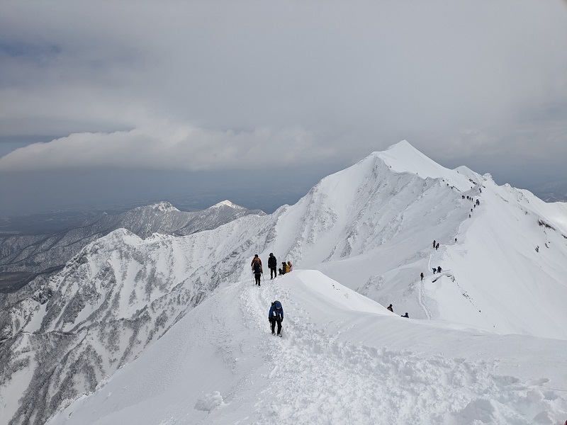 登山者が多く途中では渋滞も発生。山頂は夏山以上の人出だった。冬の間はどうしても