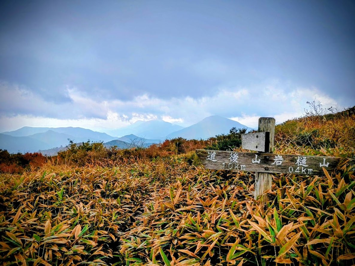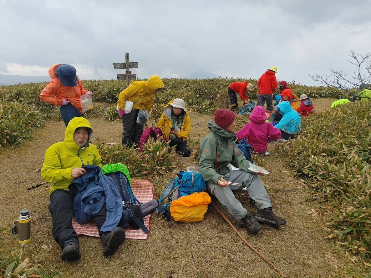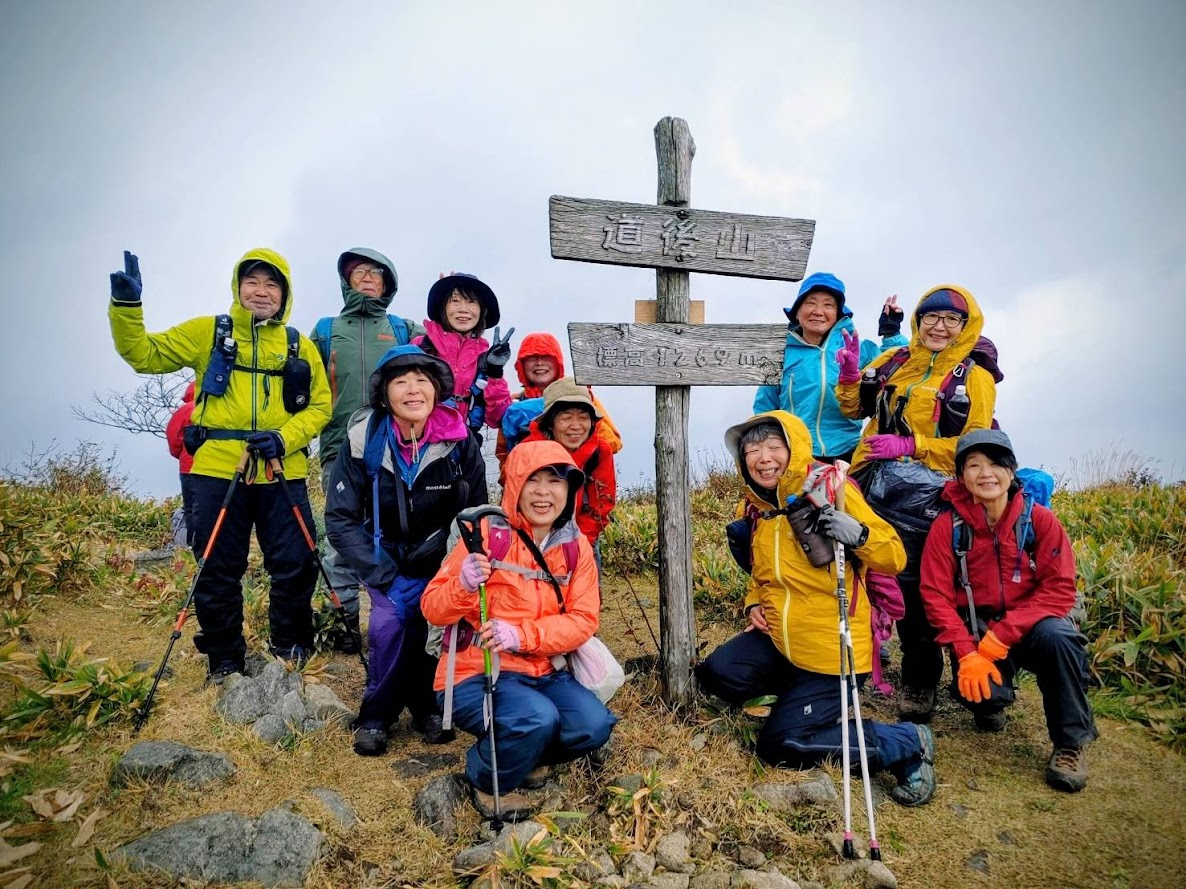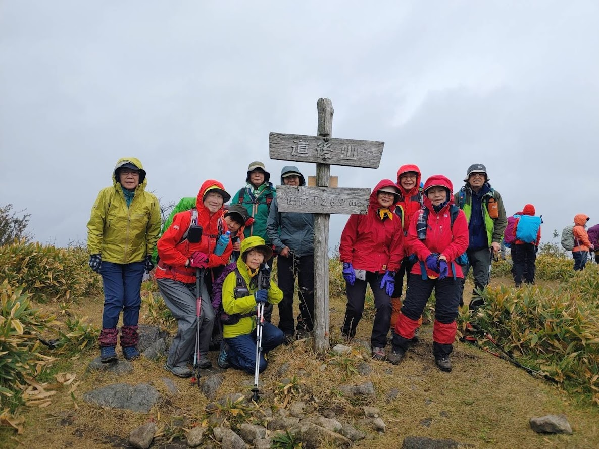 雨具を着用すると、直後に降りやんだ。道後山までは笹藪が続き所々滑りやすかった。時々小雨が降るも、