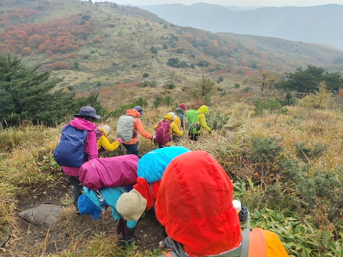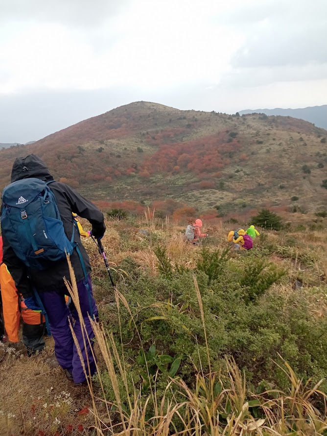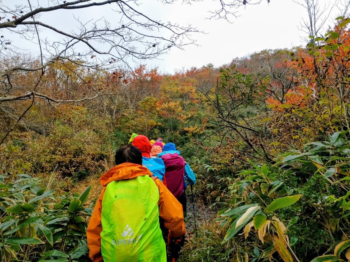 登山道は色とりどりの落ち葉で綺麗だった。岩樋山に到着すると風が冷たく、予報通り小雨が降り出し