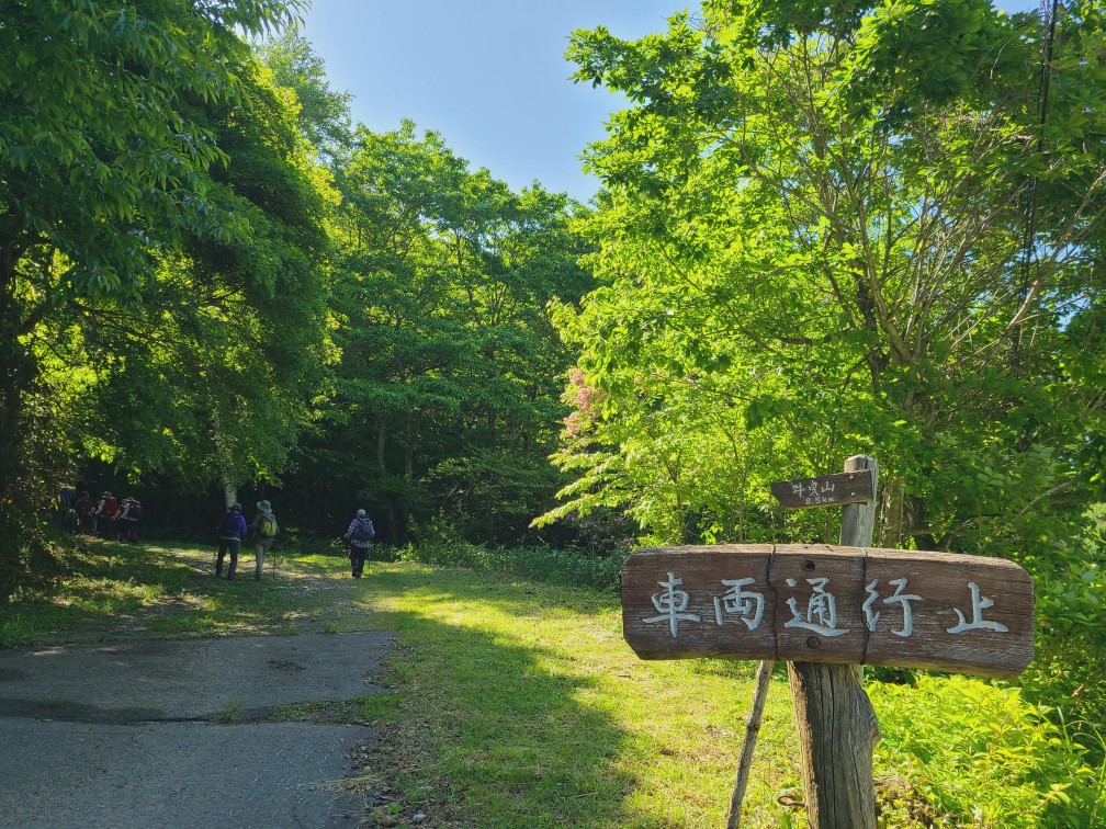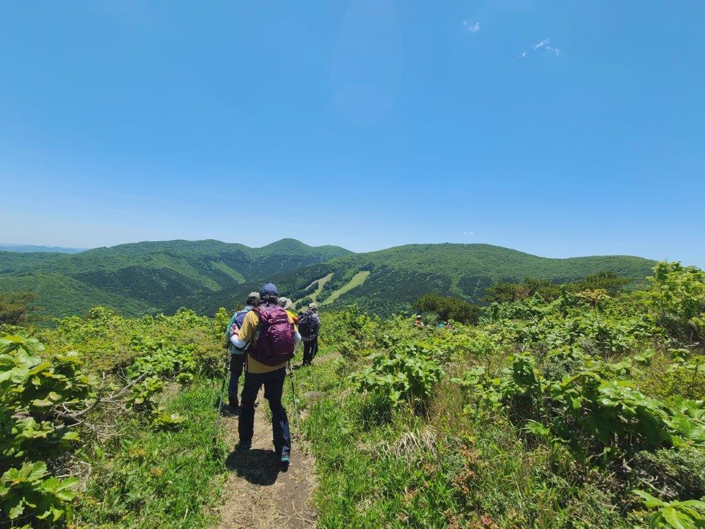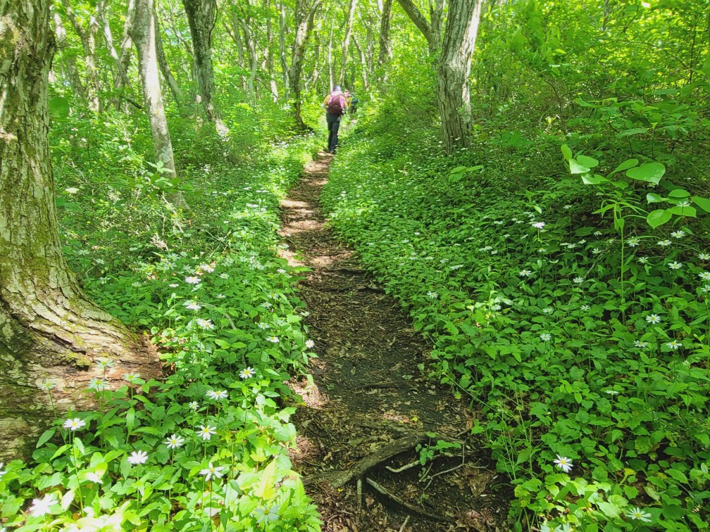 今年のミヤマヨメナの開花状況が気になりながらも、雲一つない晴天にわくわく感が止まらず、軽快な足取りでスタートしました。このコースが初めての方も数名おられました。冬季、雪が多かったせいか例年より開花は遅いようでしたが、それでも純白の可憐なヨメナが迎えてくれました。薄紫色のものも見られ、蕾もあり、今週末あたりが見頃ではないかと思いました。