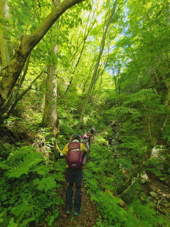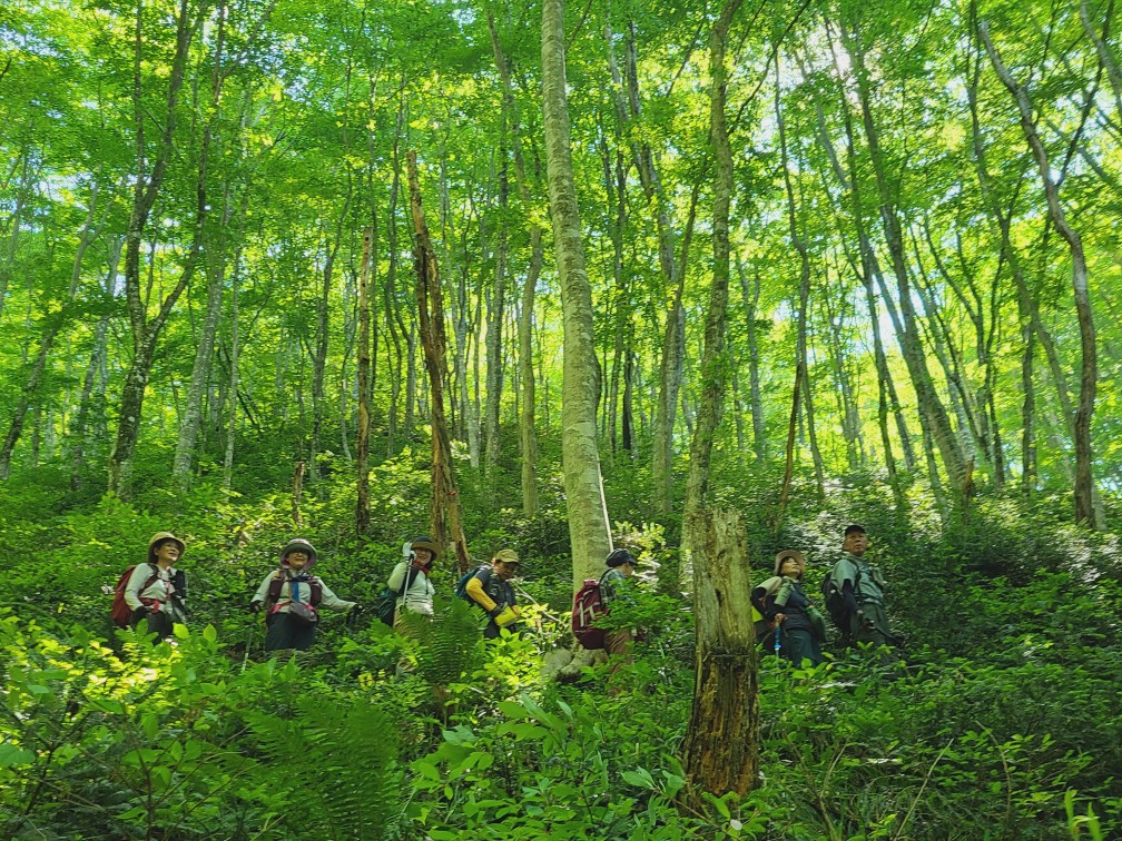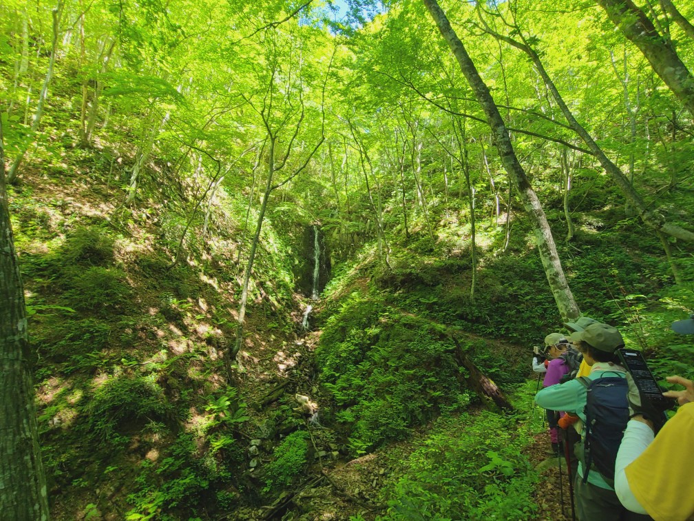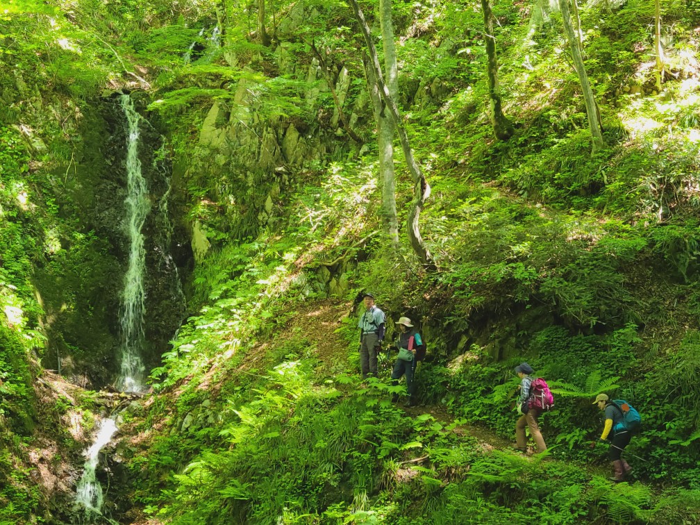 白樺林を抜け川を渡ると滝が現れ、新緑の森に癒されながら牛曳山〜伊良谷山へと向かい、毛無山までの道には白とピンクのイワカガミやマイズルソウ、ツクバネソウなどを見ることができました。毛無山の山頂では、遠くに大山も見えて、山々が息づいているような眺めは最高でした。暑くもなく、寒くもなく時折心地良い風に吹かれながら、気持ちの良い山行を楽しみました。