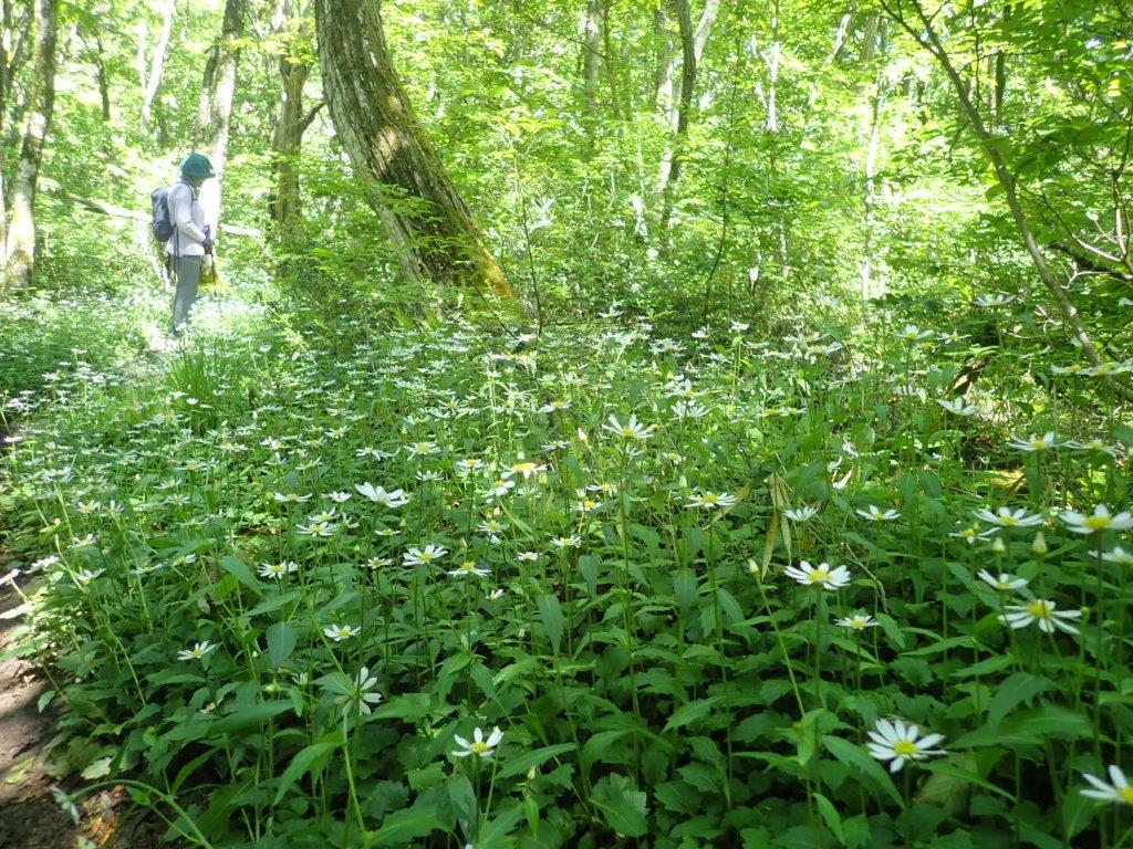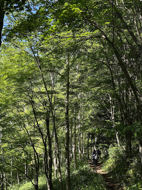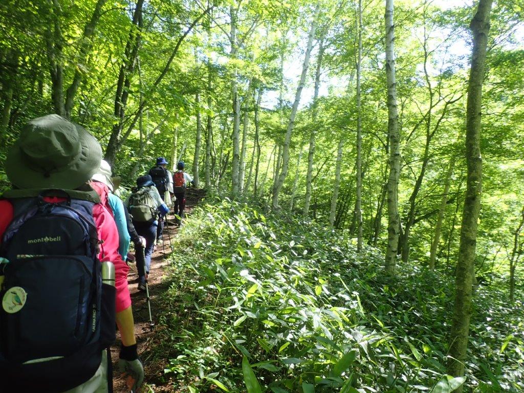 天気は快晴。白樺林も気持ちよく木洩れ日の中、足取りも軽い。伊良谷山頂で休憩を取り、毛無山へ向かう。ずっと続くヨメナに誘われて、
