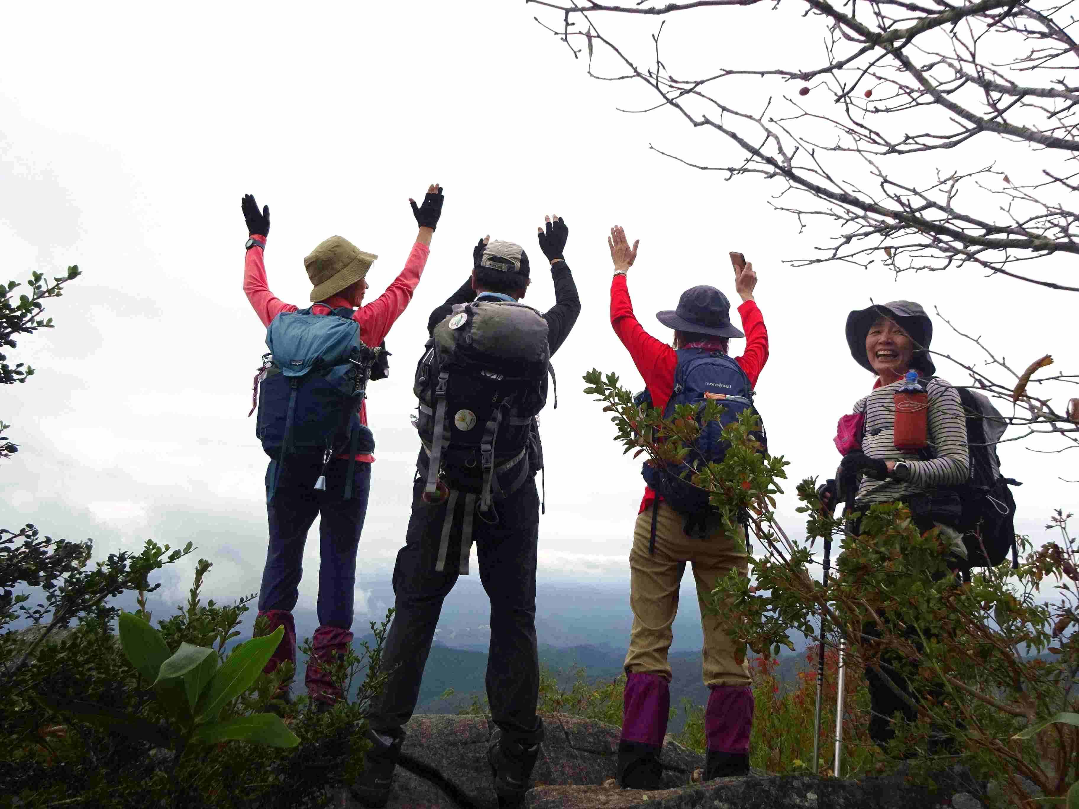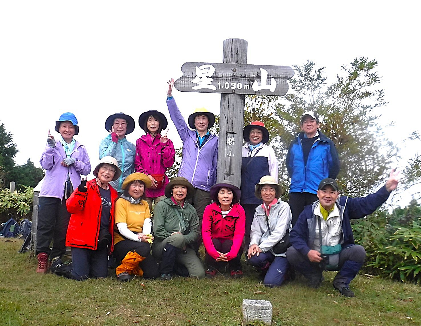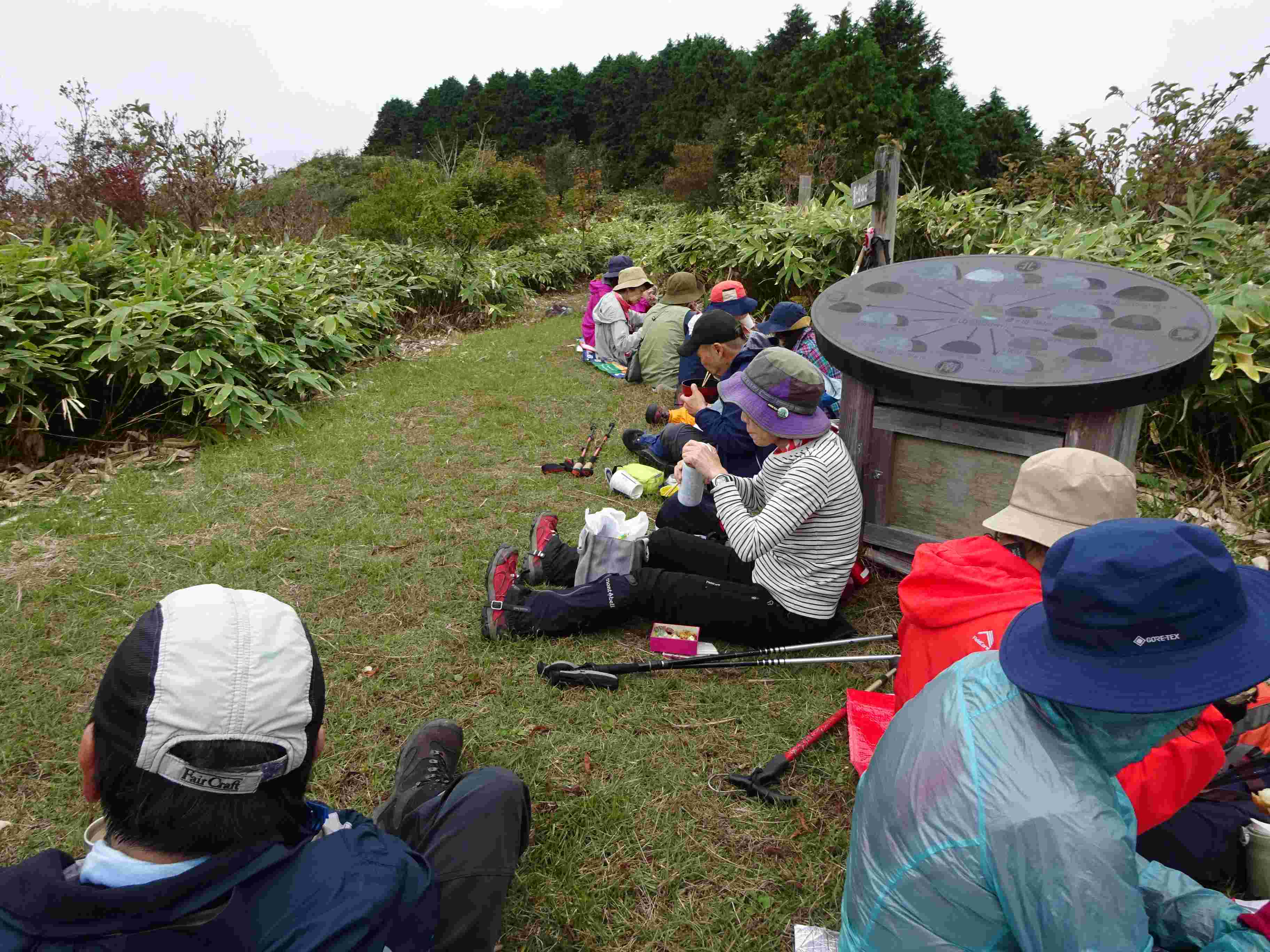 星山山頂では、残念ながら雲とガスで眺望を楽しむことはできなかったものの、腰を下ろして弁当を広げられただけでもラッキーと、みんなニコニコ。