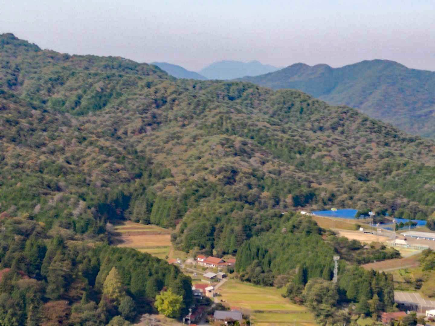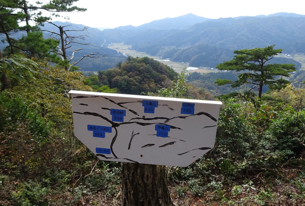 山頂から赤名峠が良く見える。右に女亀山が聳える。
