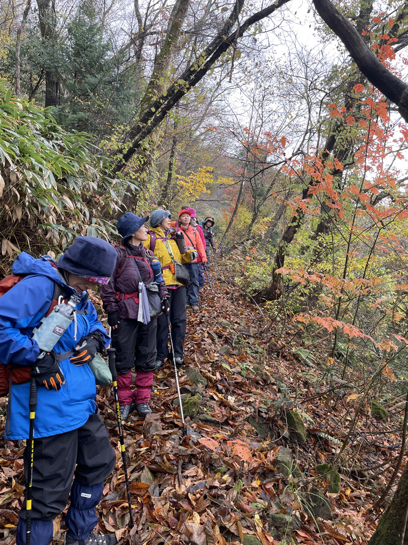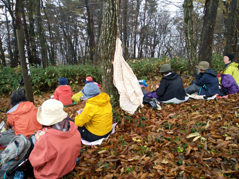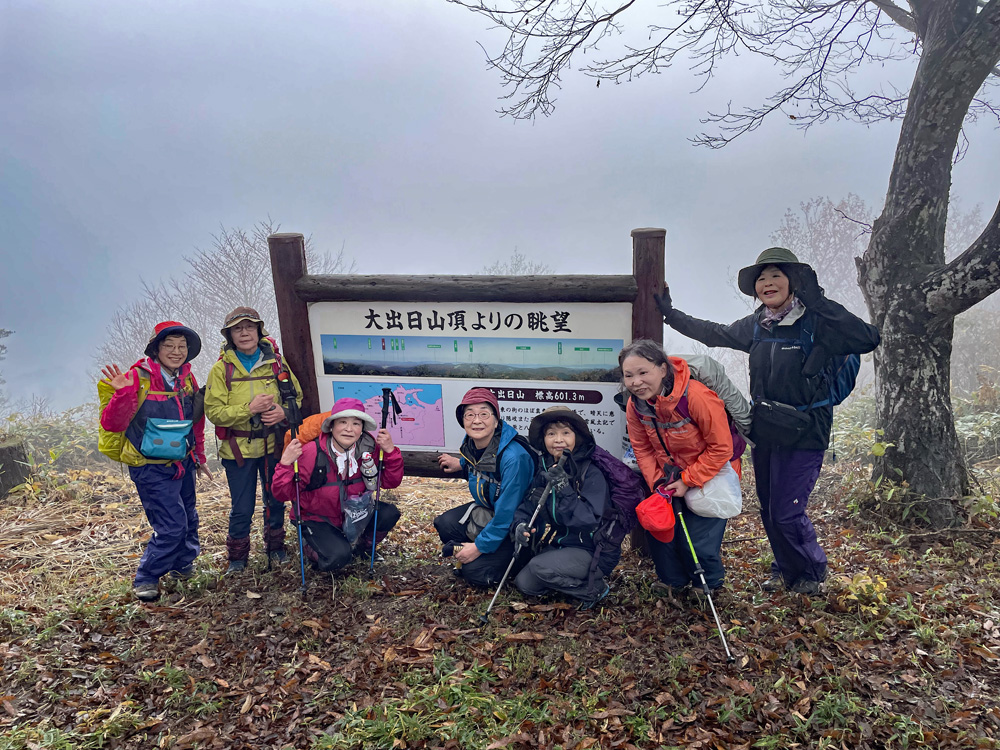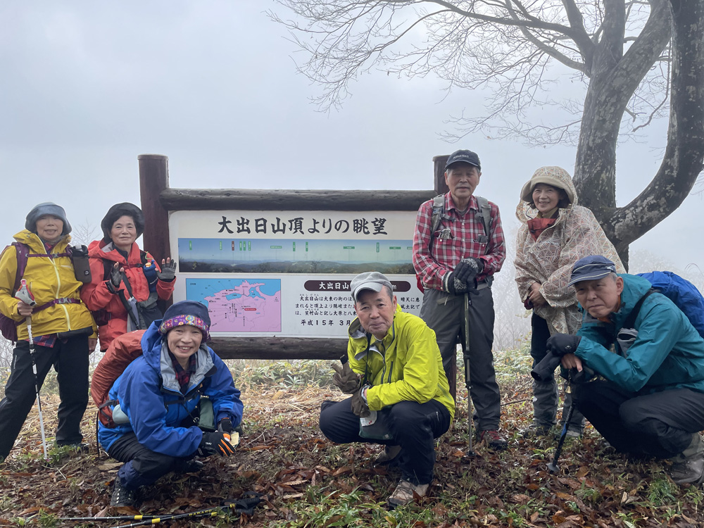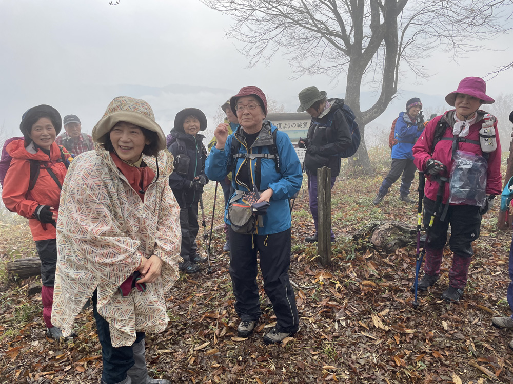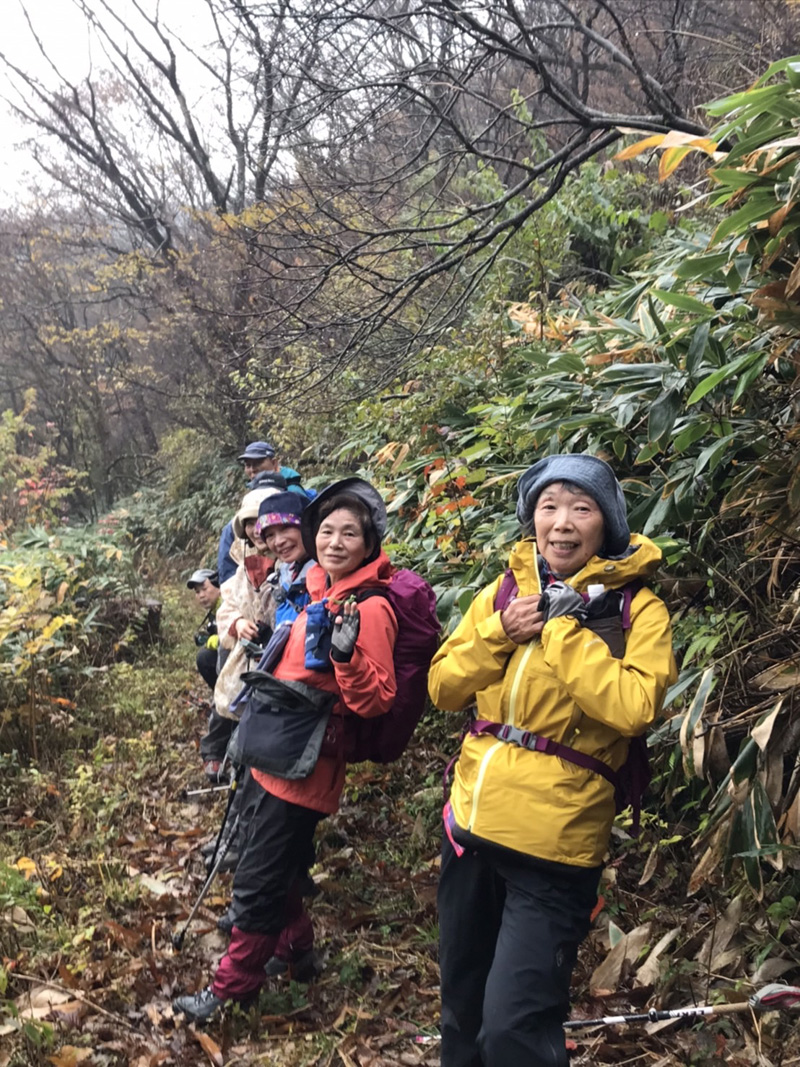 前日の雷雨に悩みましたが、決行を通知したところ続々と快諾の返事が届き、力付けられました。 駐車場でいきなり雨脚が強く降りだし、雨装備を完璧にしてスタートしました。 雨は降ったり止んだりを繰り返し、6合目を過ぎた頃ようやくあがりました。 心配していた北風の影響はなく、むしろ汗ばんだ顔に気持ちいいくらいでした。 頂上からの展望は望めませんでしたが、眼下の低山を埋める重そうな雲海が幻想的でした。 「積雪時しか登っていなかったので、こんなに石がゴロゴロしていたとは!」 「楽しかった、雨でも平気」等の感想をいただきました。 全員が協力しあってこその安全山行だったとかみしめています。