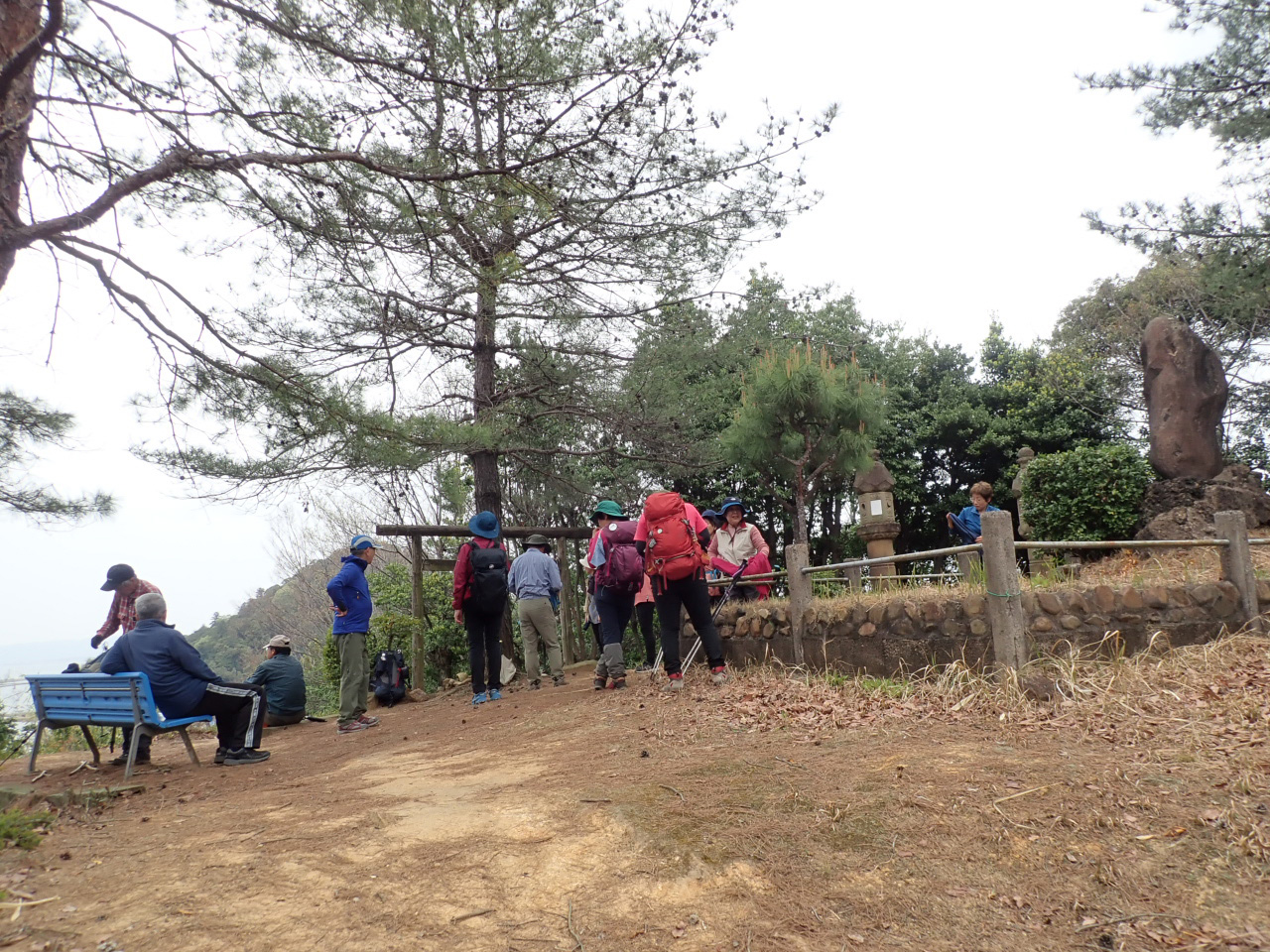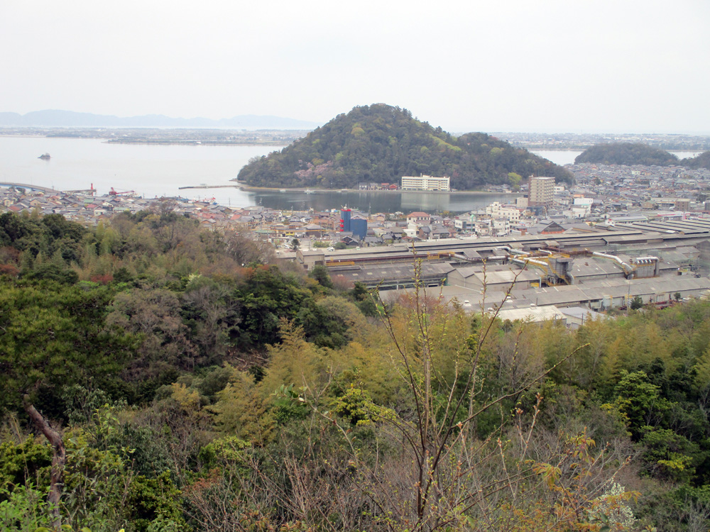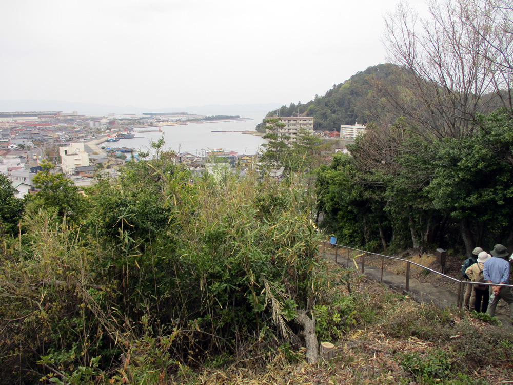 天守跡からは市街地が一望に、しばし日本海、中海を眺め東屋でお試し参加の2名も加わって昼食タイム、