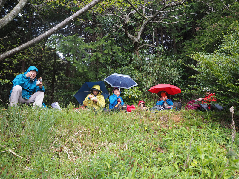 巨岩で休憩。雨が心配で相談中だ