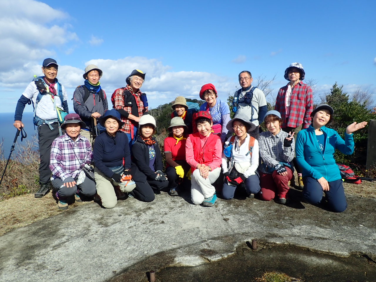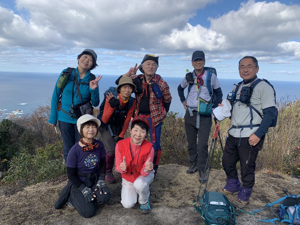 初めて登ったメンバーは約半数。風もなく、予想していた程寒さは感じられず、のんびり穏やかな日本海を眺めて初冬の山行を楽しんだ。(報告:吉田)