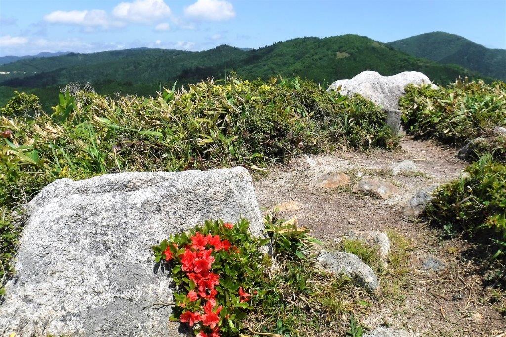 頂上で唯一の花!ヤマツツジ。後(東方)には花知ヶ仙