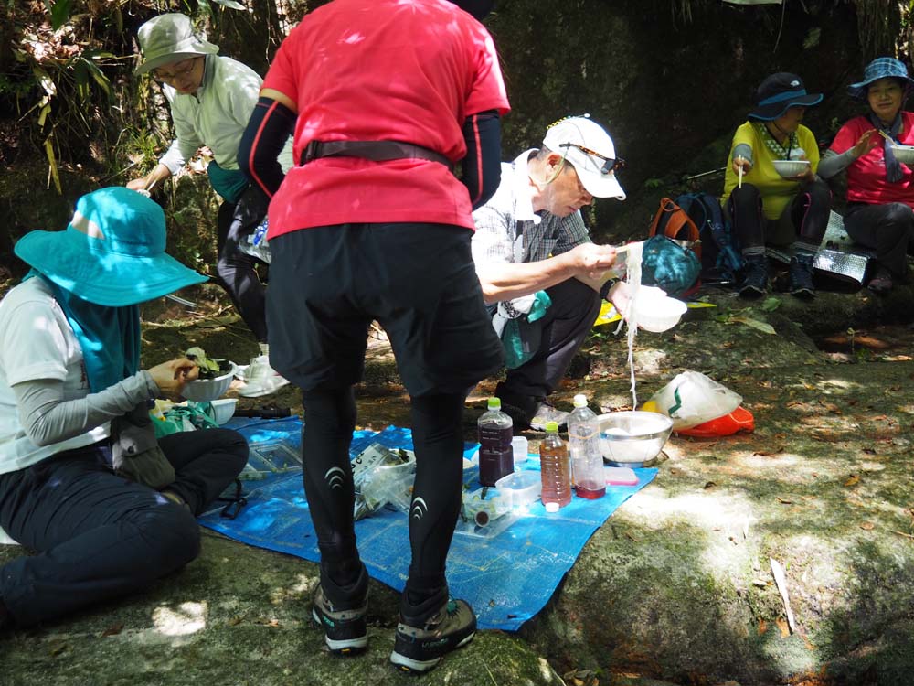 私たちは滝の上の一枚岩に座りソウメンの大盛りで 楽しんだのだ。女性陣の活躍に感謝を惜しみません。