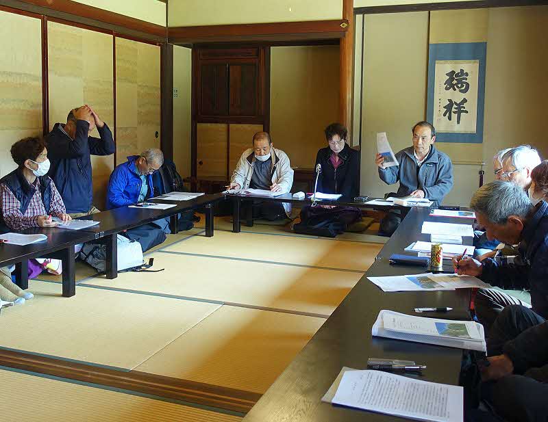 当日午前は花散らしの風雨で、悪天候の中出席の27名で総会が始まった。議事では一年のクラブ山行や