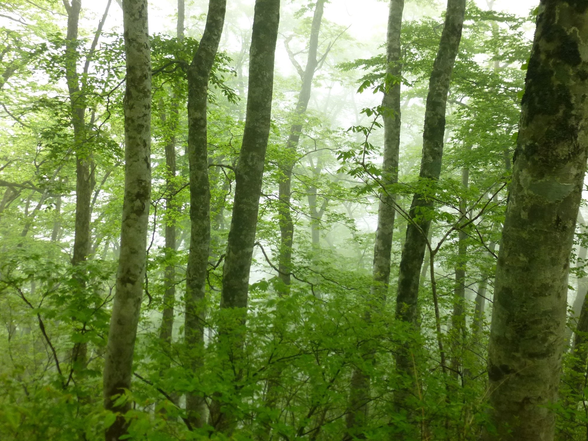 林道両脇の霧のブナ林を、独り占めで進む♪