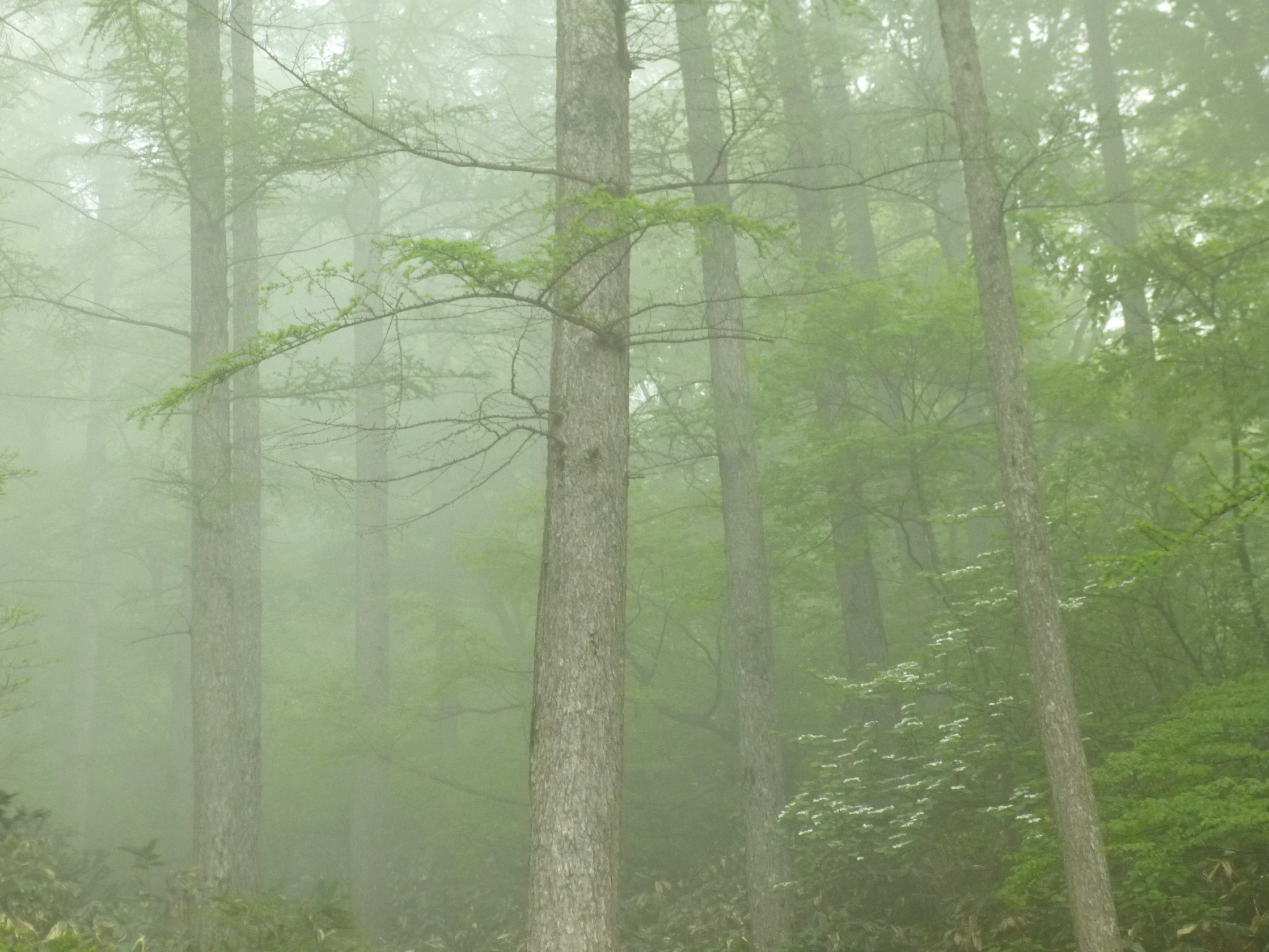 昼頃には森の中、オオカメノキの花が 霧に霞む。