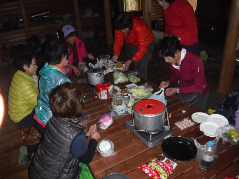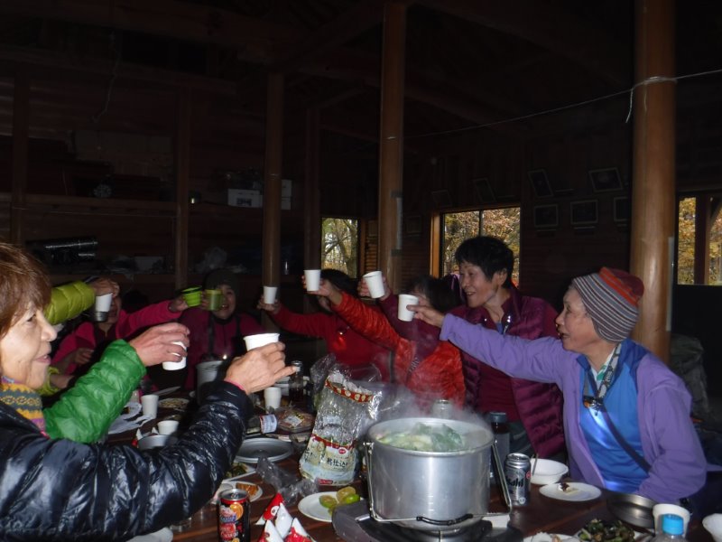 T弘さん企画による小屋泊。計14名が参加。割り当ての食材や善意のお酒などで