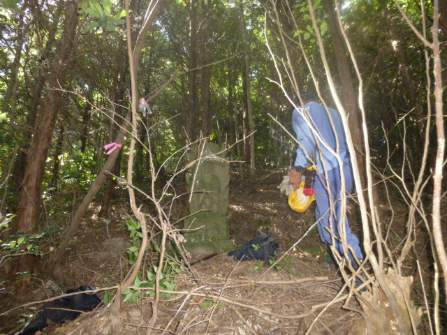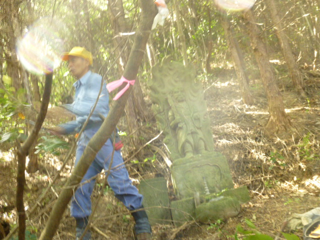 道は消滅しているが、鳥居跡や狛犬のある上部へ向かい、山頂へ到達。