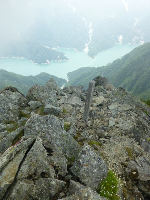 針の木山頂より幻の色彩の黒部湖を見下ろす。