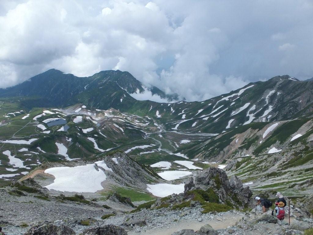 雷鳥沢キャンプ場と立山方面(縦走路はハクサンイチゲ、チングルマなど白い花が多かった)