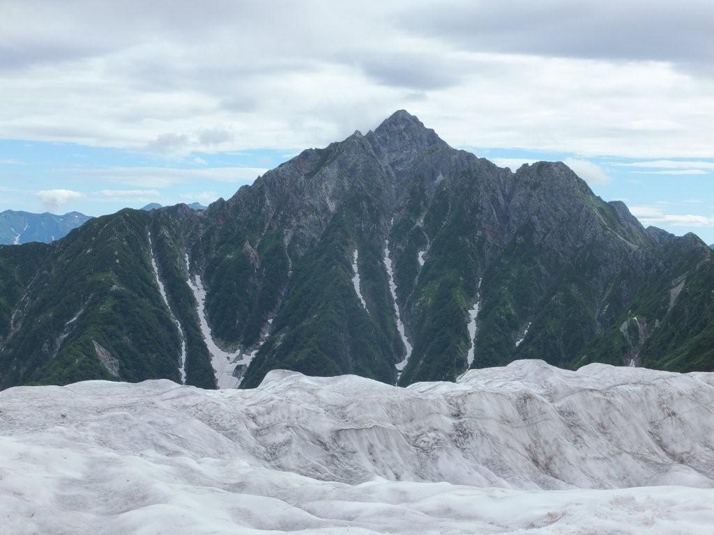 大日岳縦走路より間近にみる雪渓の向こうの剱岳