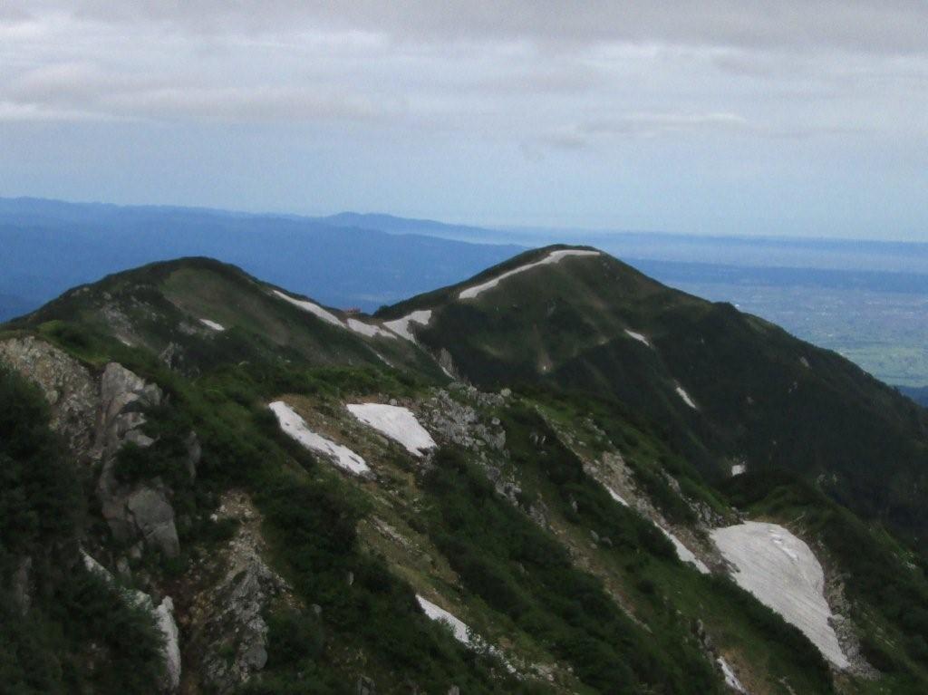 中大日岳と大日岳の間に大日小屋が見え始める。日本海、富山の町がきれい。