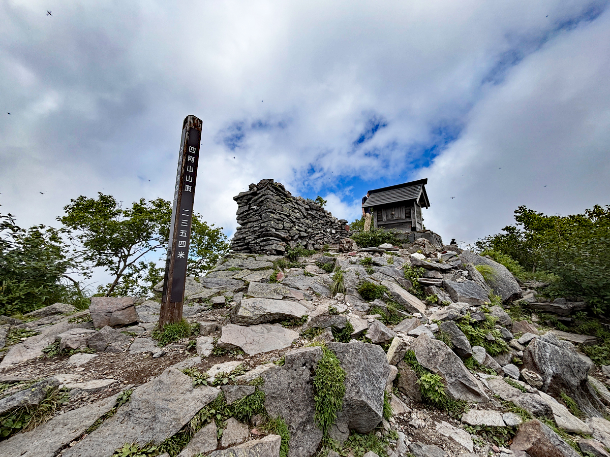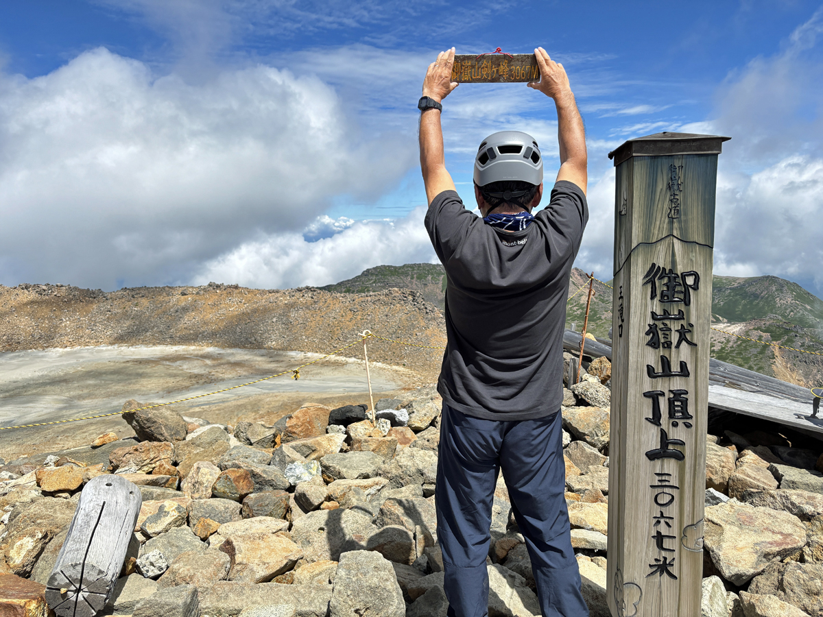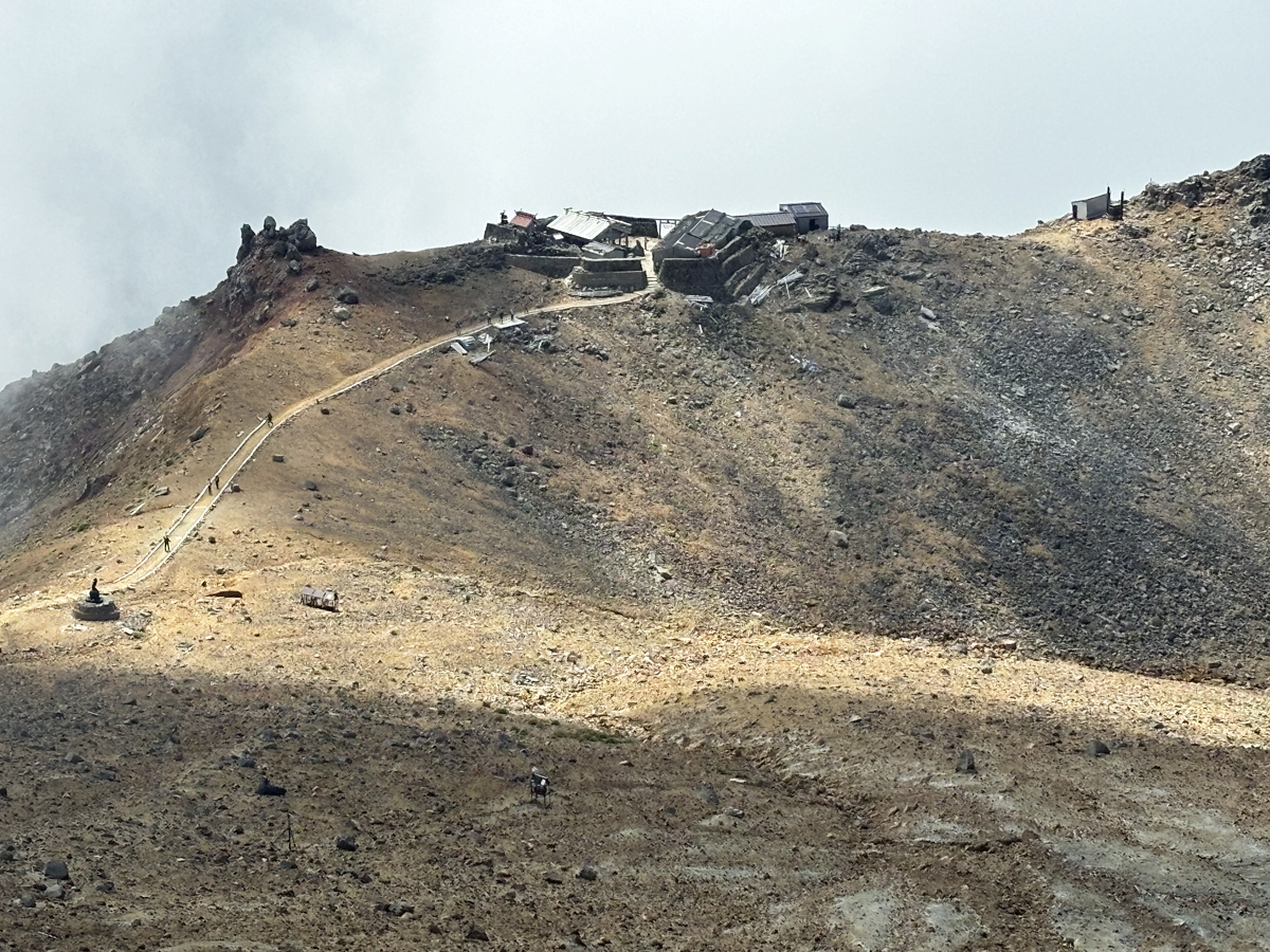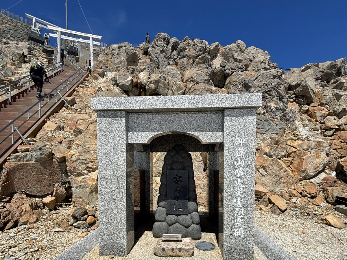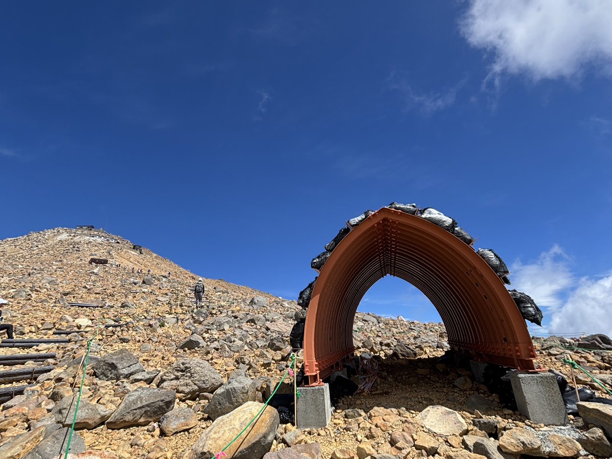 御嶽山の大惨事から11年、今回慰霊登山として絶対登りたかった御嶽山です。御嶽神社の鳥居をくぐっていざ出発。王滝山頂までは植物も生えいて「大山的」な登りが続きますが王滝頂上付近から景色が一変、植物がほとんどない荒涼とした火山の景色に変わり所々にシェルターが設置されていて緊張感がありました。慰霊碑は剣ヶ峰直下に設置されていましたのでご冥福をお祈りしました(合掌)。この山域はヘルメット推奨ですが、二の池小屋で実際に飛んできた噴石を持ってみてヘルメットではどうしようもないということを実感しました。