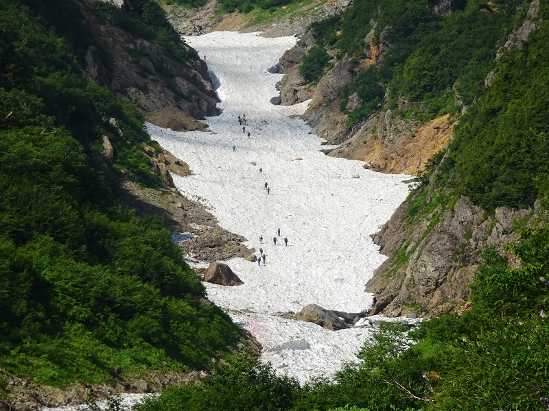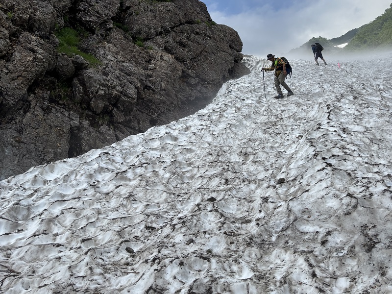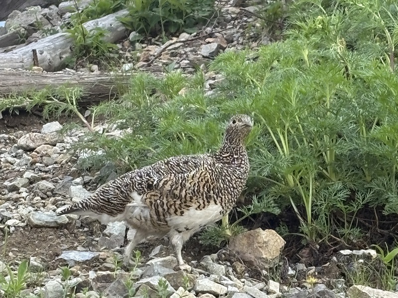 針ノ木大雪渓には沢山雪が残っていて涼みながらサクサク登れました。しかし雪渓が終わってからは急登の連続、特に最後の最後のジグザク登りは心が折れそうになりましたが、小屋直前で雷鳥が出迎えてくれ元気が出ました。針ノ木山頂はガスで展望はありませんでしたが沢山の高山植物が咲き満たれ心が満たされました。