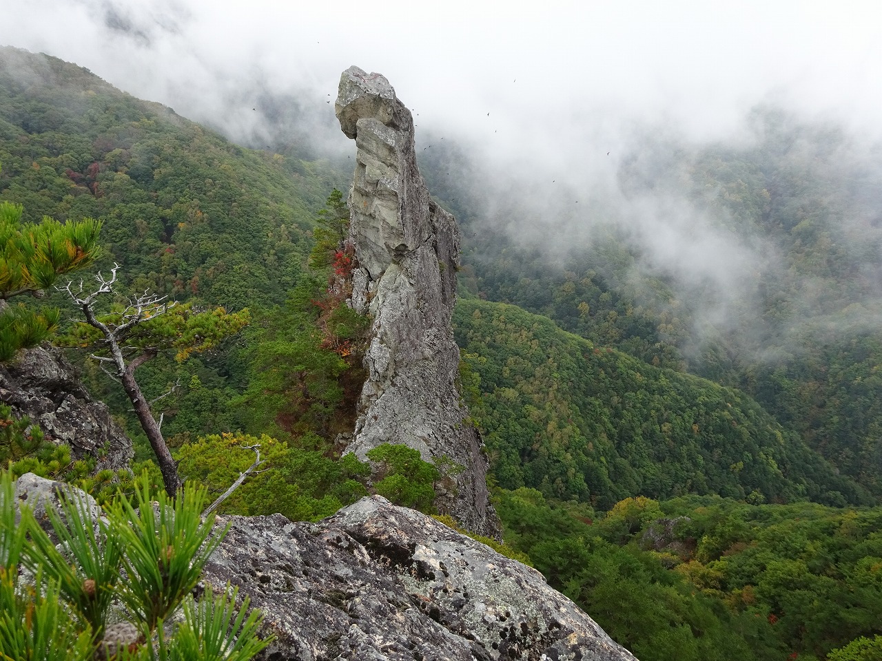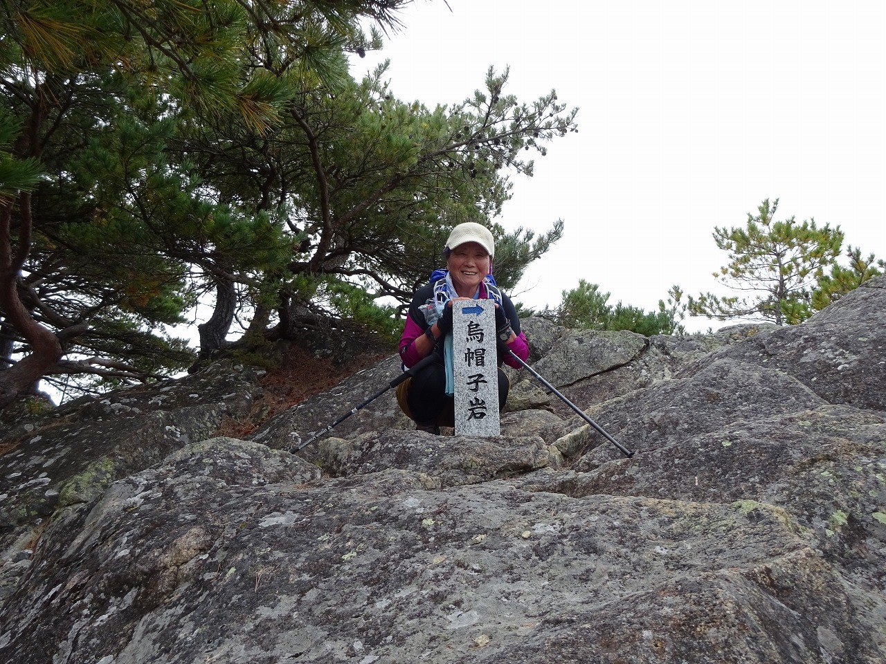 10 烏帽子岩1628m。圧巻で目が覚めた。てっぺんにカラビナとザイルが。かっこいい岩だ