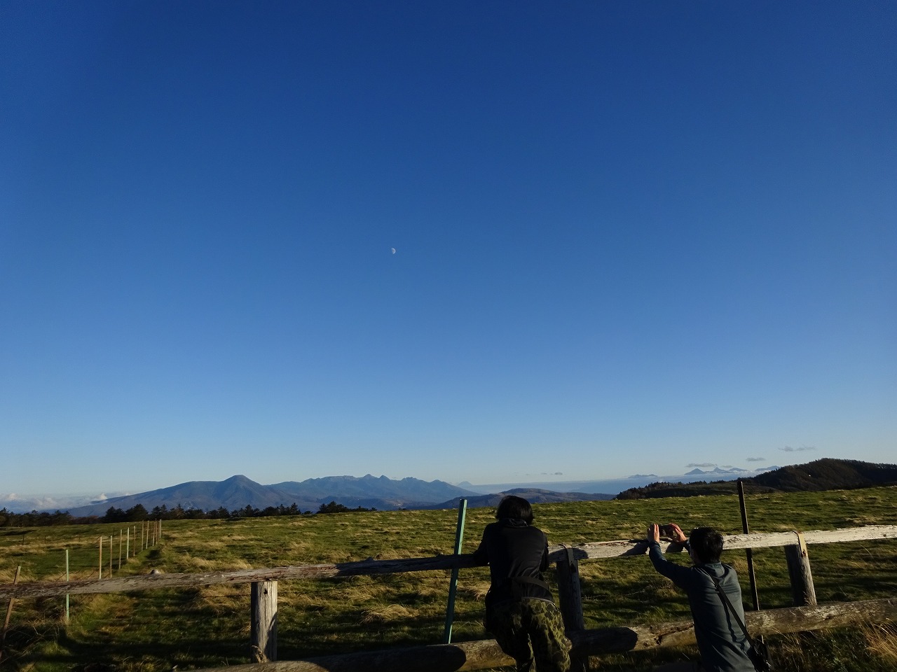 20若者は牧場の上の月を撮っているのかな?八ケ岳を撮っているのかな?三角の山は蓼科山。