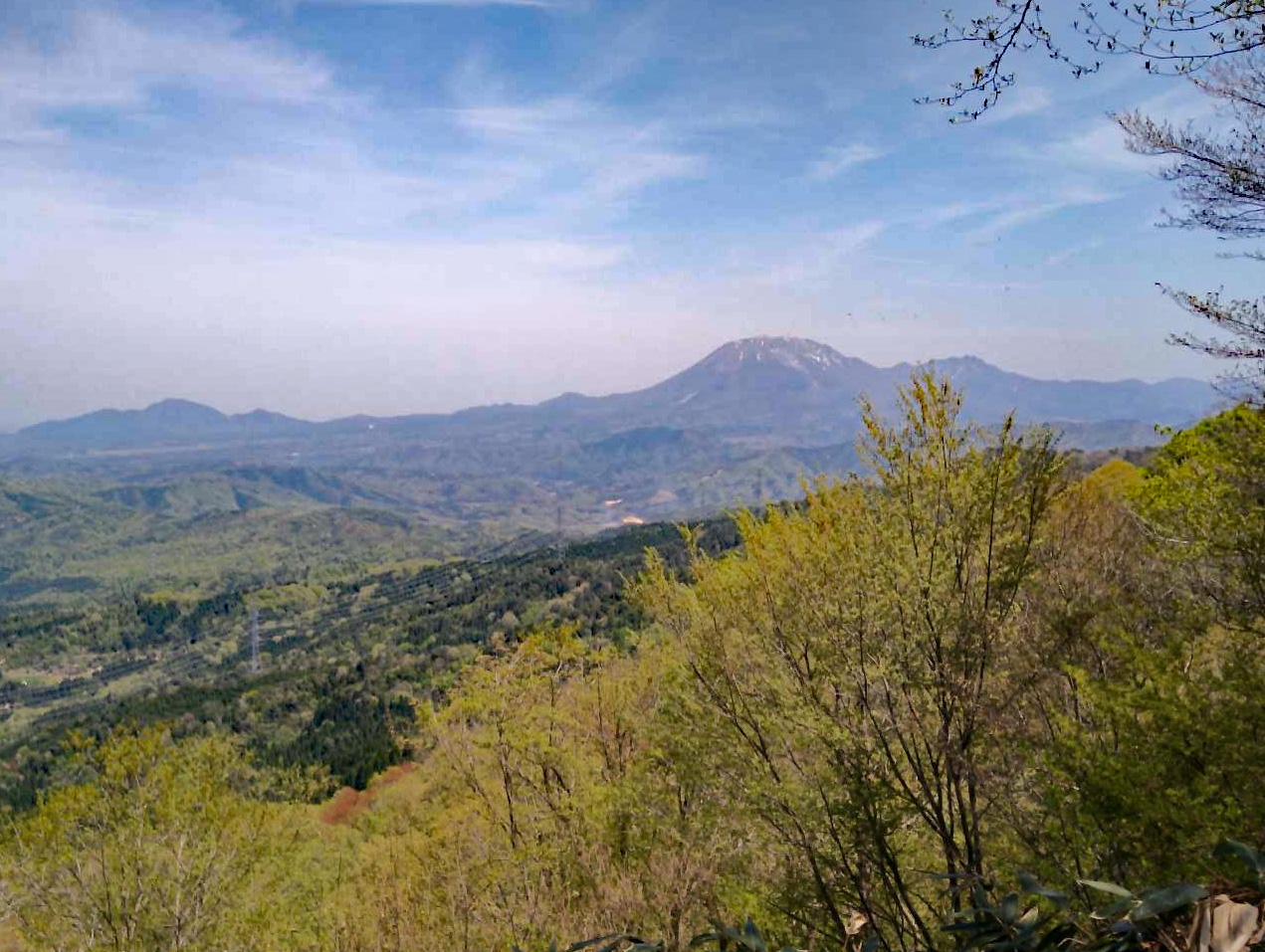 山頂からは、北方に残雪が筋状の残る大山、手前には金華山、手間要害山等の淡い